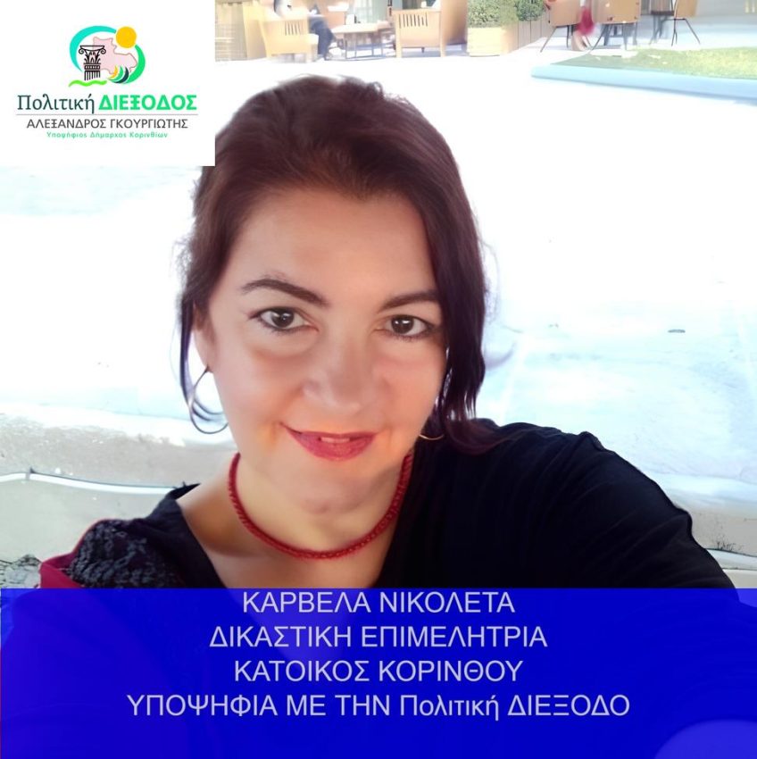 Η «Πολιτική ΔΙΕΞΟΔΟΣ» και ο επικεφαλής της Αλέξανδρος Γκουργιώτης, υποψήφιος Δήμαρχος Κορινθίων, καλωσορίζουμε τη δικαστική επιμελήτρια, Νικολέτα Καρβέλα.