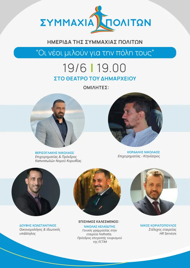 Τον λόγο στους νέους δίνει η Συμμαχία Πολιτών την ερχόμενη Δευτέρα 19 Ιουνίου, στις 19.00, στο θέατρο του Δημαρχείου Κορίνθου. Στόχος να καταγραφούν οι προβληματισμοί, οι σκέψεις και οι προτάσεις της νεολαίας, που μπορούν να προσφέρουν πολλά περισσότερα από μια απλή καταγραφή των απόψεων, καθώς η φρέσκια ματιά μπορεί να δώσει λύσεις.