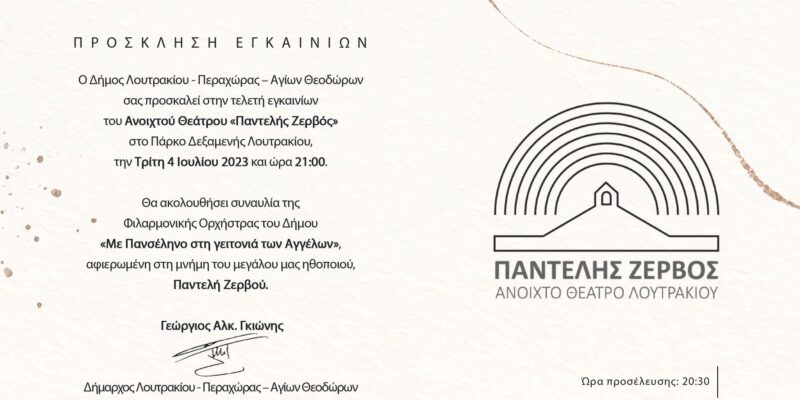 Ο Δήμος Λουτρακίου – Περαχώρας – Αγίων Θεοδώρων σας προσκαλεί στην τελετή εγκαινίων του Ανοιχτού Θεάτρου «Παντελής Ζερβός» στο Πάρκο Δεξαμενής Λουτρακίου, την Τρίτη 4 Ιουλίου 2023 και ώρα 21:00.