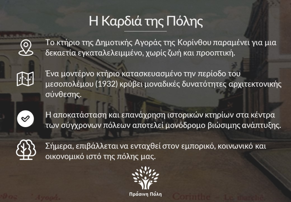 Την πρότασή της για την Δημοτική Αγορά, το πιο ιστορικό κτήριο στο κέντρο της πόλης, που μένει για χρόνια αναξιοποίητο, κατέθεσε η Πράσινη Πόλη, με έναν έξυπνο και πρωτότυπο τρόπο.