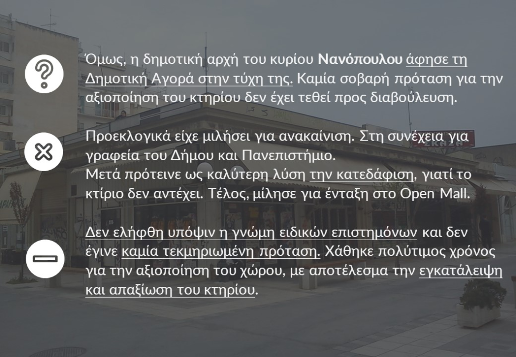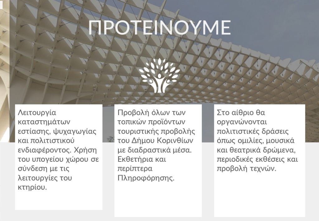 Ανάμεσα σε αυτά που προτείνει είναι η διατήρηση του υπάρχοντος ισογείου και υπογείου, προσθήκη νέου ορόφου που θα συνδέει την μεσοπολεμική μοντέρνα αρχιτεκτονική αντίληψη με τον σχεδιασμό επανάχρησης των κτιρίων, λειτουργία καταστημάτων εστίασης κ.λπ.
