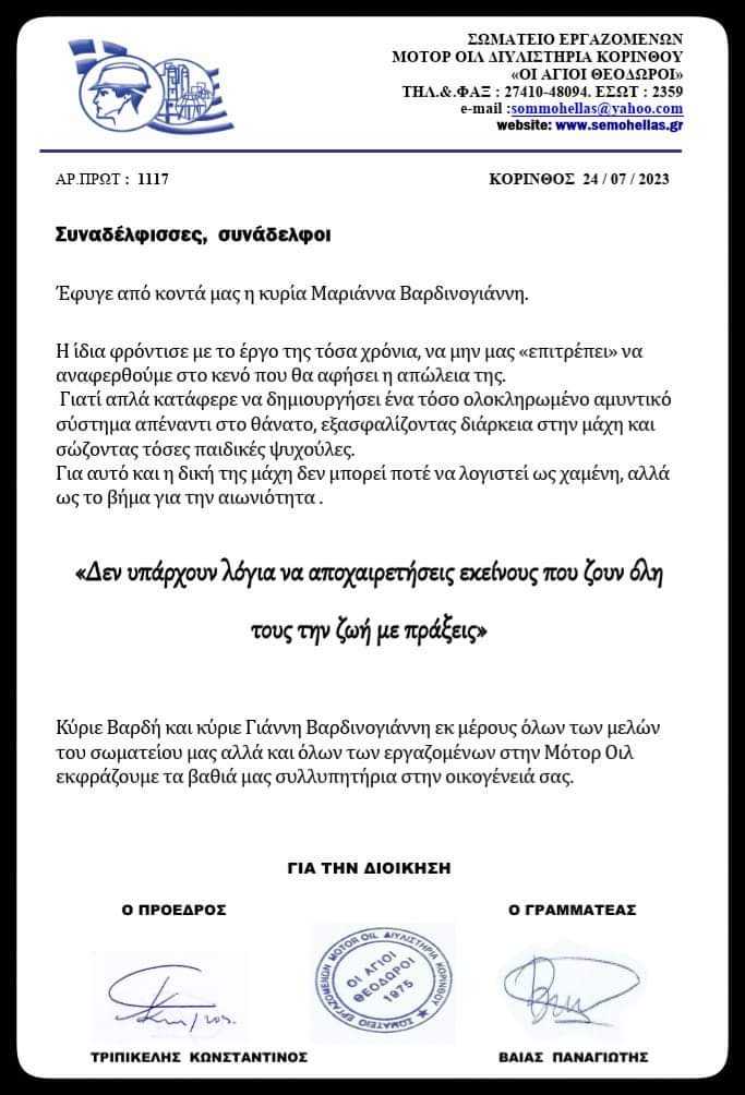 Ανακοίνωση εξέδωσε το Σωματείο των εργαζομένων στην Μότορ Όιλ για τον θάνατο της Μαριάννας Βαρδινογιάννη. Στην ανακοίνωση οι εργαζόμενοι μνημονεύουν το έργο της με το ίδρυμα Ελπίδα, σημειώνοντας χαρακτηριστικά πως “δεν υπάρχουν λόγια να αποχαιρετήσεις αυτούς που ζουν όλη του τη ζωή με πράξεις…”.