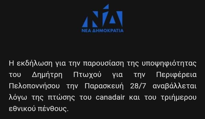 Αναβλήθηκε για δεύτερη φορά η παρουσίαση της υποψηφιότητας του Δημήτρη Πτωχού στην Περιφέρεια Πελοποννήσου που είχε προγραμματιστεί να γίνει σε εκδήλωση στην Μεσσήνη την Παρασκευή 28/7/23 ώρα 18:00.