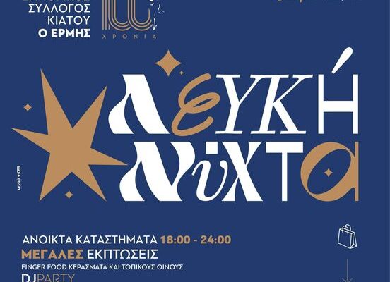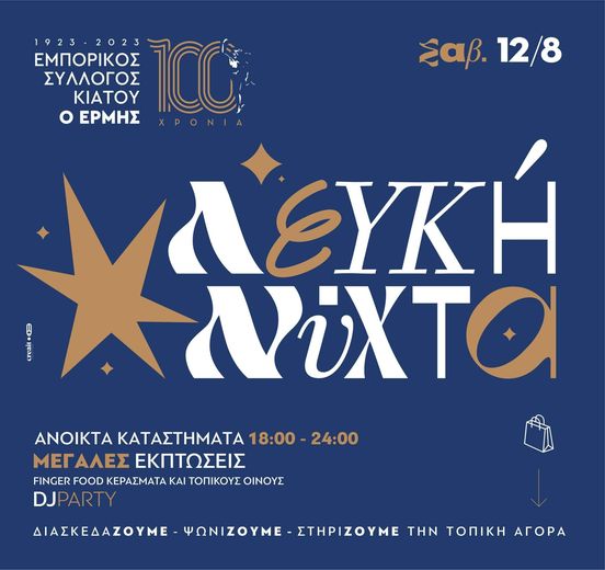 Ο εμπορικός κόσμος του Κιάτου γιορτάζει και σας καλεί όλους το Σάββατο 12 Αυγούστου στην “Λευκή Νύχτα”, που έχει καθιερωθεί πια, με τιμές ασυναγώνιστες. Θα υπάρχουν κεράσματα και άφθονο κρασί για όλους που θα μοιράζονται σε διάφορα σημεία στον πεζόδρομο παρέα με live dj party για μια βραδιά ξεχωριστή και συνάμα επετειακή!