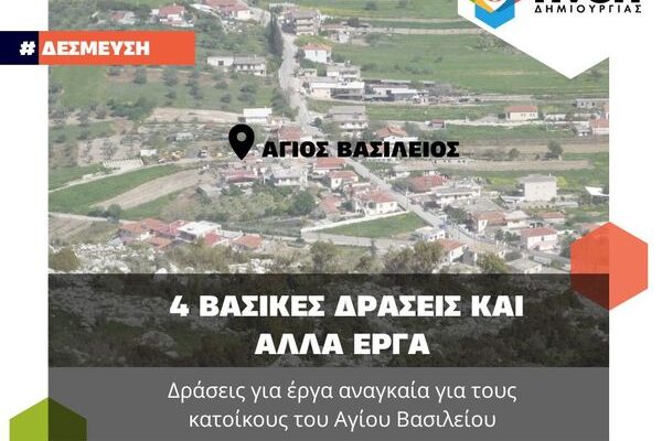 Τέσσερις βασικές δράσεις για έργα αναγκαία για τους κατοίκους του Αγίου Βασιλείου δεσμεύεται να πραγματοποιήσει στην διάρκεια της θητείας της η παράταξη Πνοή Δημιουργίας, πέραν των άλλων δράσεων έργων και καθημερινότητας. Αυτό δηλώνει σε δελτίο Τύπου που ανάρτησε και όπου αναφέρει: