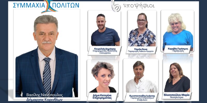 Τον Δήμαρχο Βασίλη Νανόπουλο και την ΣΥΜΜΑΧΙΑ ΠΟΛΙΤΩΝ εμπιστεύονται συμπολίτες από κάθε γωνιά του δήμου Κορινθίων. Ο συνδυασμός καταρτίζει ισχυρά ψηφοδέλτια σε κάθε κοινότητα υποδεχόμενος συμπολίτες από κάθε παραγωγικό κλάδο, με μια και μοναδική στόχευση. Την δημιουργία μιας νέας, ισχυρής και αποτελεσματικής  αποδοτικής ώστε στην επόμενη θητεία, να υλοποιηθούν όσα έχουν σχεδιαστεί, όσα προτείνονται τώρα και όσα είναι απαραίτητο να γίνουν!