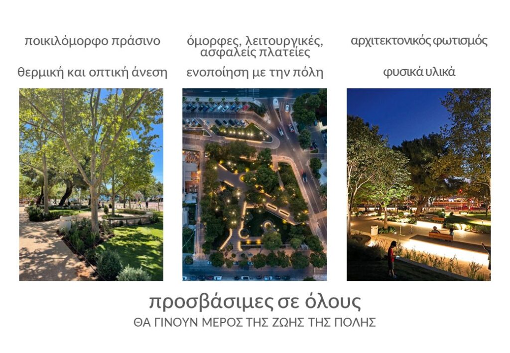 - Οι νέες πλατείες θα έχουν ποικιλόμορφο πράσινο και ψηλά δέντρα, με ειδική μελέτη φωτισμού και σημεία δροσισμού για τις ημέρες καύσωνα.