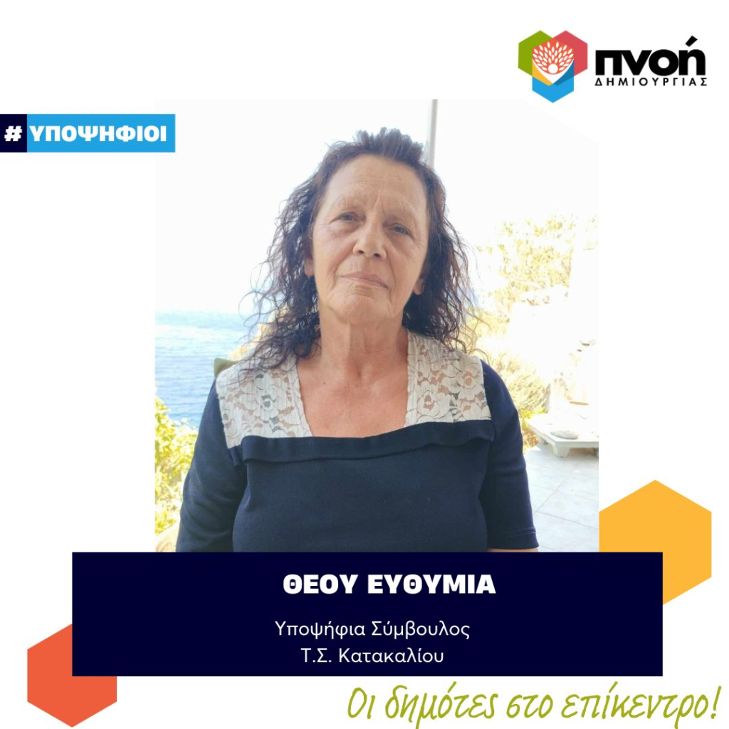 Η Ευθυμία Θέου είναι συνταξιούχος, μόνιμος κάτοικος οικισμού Βάγιας Κατακαλίου. Είναι παντρεμένη με δύο παιδιά και τρία εγγόνια. Δηλώνει έτοιμη να προσφέρει στον τόπο της και να αλλάξουμε σελίδα στο Δήμο.