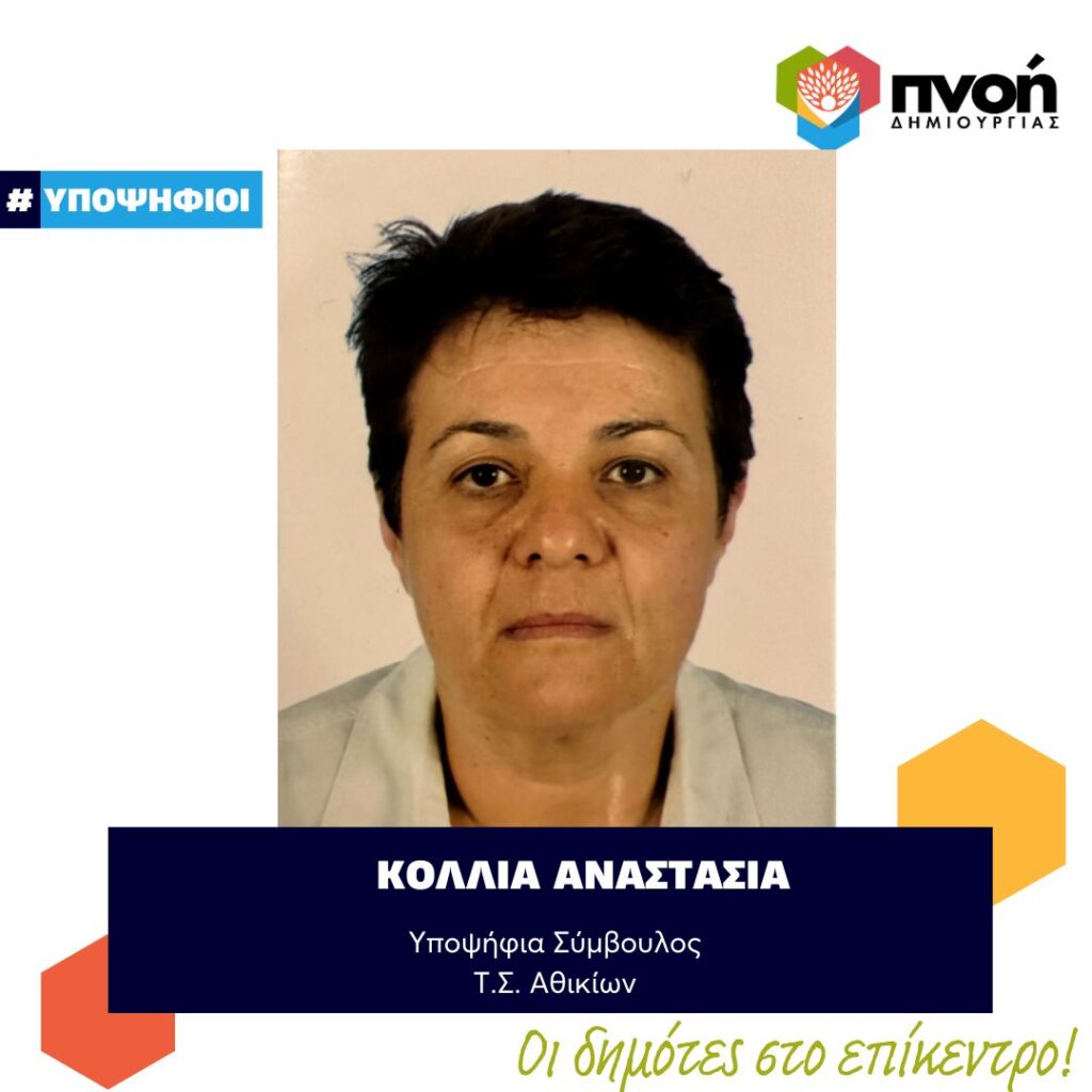 Η Αναστασία Κόλλια του Ευαγγέλου έχει εργαστεί στην υπηρεσία Καθαριότητας του Δήμου Κορινθίων για τέσσερα έτη ενώ τον τελευταίο χρόνο απασχολείται σε Ιδιωτική Εταιρεία Τροφίμων της περιοχής. Διαμένει μόνιμα στα Αθίκια Κορινθίας απ’ όπου και κατάγεται. Συμμετέχει για πρώτη φορά σε εκλογές τοπικής αυτοδιοίκησης και επιθυμεί να βάλει και εκείνη το λιθαράκι της για το καλό του τόπου της.