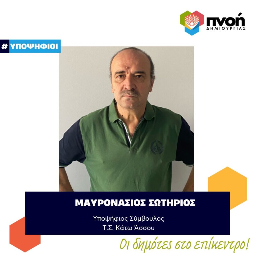 Ο Σωτήρης Μαυρονάσιος είναι γνωστός σε όλους μας από την δραστηριοποίηση του στο χώρο του ποδοσφαίρου, όπου και έχει υπηρετήσει ως ποδοσφαιριστής, προπονητής και πρόεδρος. Κατάγεται από τον Άσσο Κορινθίας, όπου και διαμένει μόνιμα. Είναι πατέρας 2 παιδιών και παππούς 3 εγγονών. Η αγάπη του Σωτήρη για τον αθλητισμό και ιδιαίτερα για το ποδόσφαιρο τον έκαναν να πάρει την απόφαση να ασχοληθεί με την αυτοδιοίκηση, όπου και θέλει μέσω του Συνδυασμού Πνοή Δημιουργίας του Νίκου Σταυρέλη να προσφέρει τα μέγιστα.