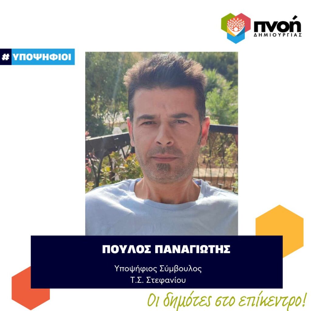 Ο Παναγιώτης Πούλος του Χρήστου είναι ιδιωτικός υπάλληλος, παντρεμένος με την επίσης ιδιωτική υπάλληλο Μαρία Σαμολαδά. Γεννήθηκε στο Στεφάνι Κορινθίας όπου και διαμένει μόνιμα με την οικογένεια του. Η θέληση του Παναγιώτη να προσφέρει στο χωριό του, τον έκαναν να πάρει την απόφαση να ασχοληθεί με την αυτοδιοίκηση και με την Πνοή Δημιουργίας του Νίκου Σταυρέλη.