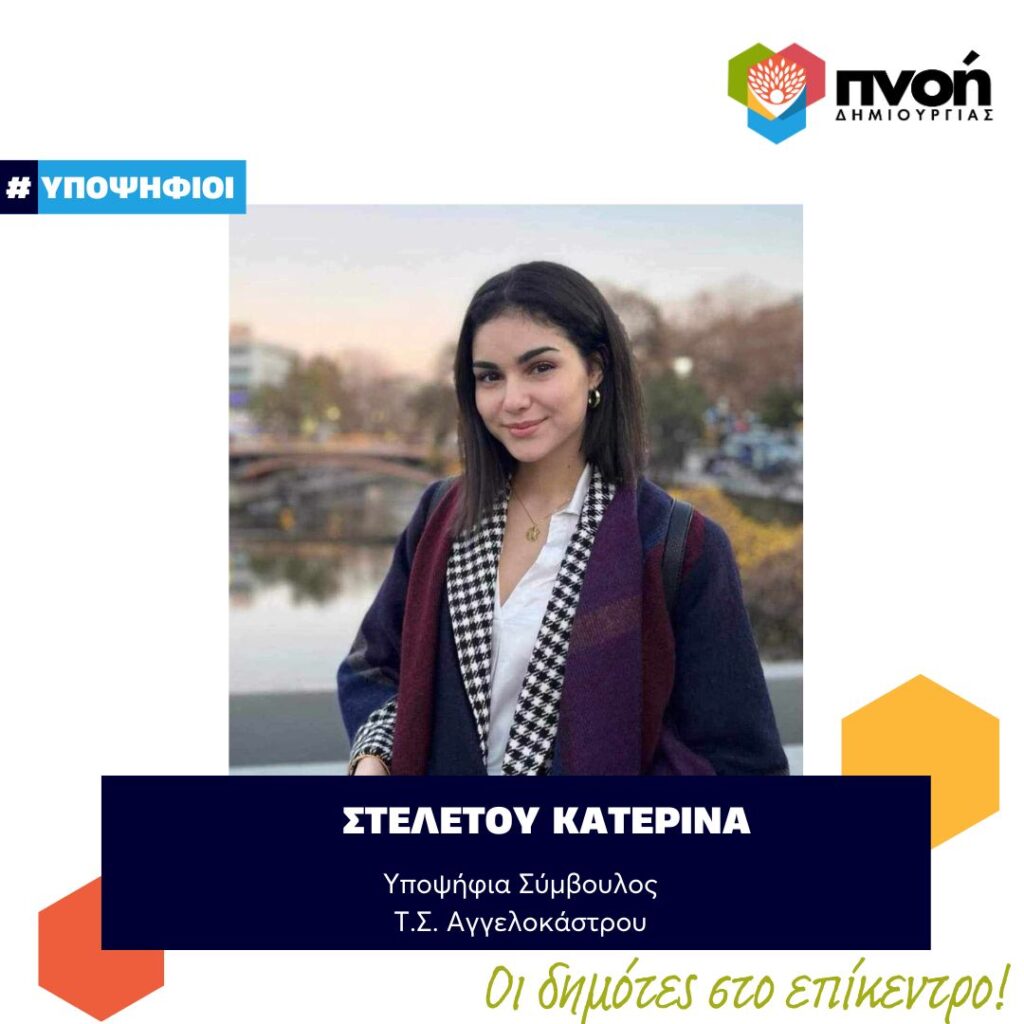 Η Κατερίνα σπουδάζει νοσηλευτική στην Πάτρα. Είναι κόρη του Δημήτρη Στελέτου και της Ελένης Δασκαλάκη. Έχει καταγωγή από το Αγγελόκαστρο (παππούς της ο Βασίλης Στελέτος αυτοκινητιστής και γιαγιά της η Ευαγγελία Βίρλα). Σήμερα κατοικεί στην Κόρινθο. Αποφάσισε την κάθοδο της στο τοπικό ψηφοδέλτιο του Αγγελοκάστρου, για να τιμήσει την αγάπη του πατέρα της και του παππού της, οι οποίοι δεν βρίσκονται στη ζωή, για το Αγγελόκαστρο.
