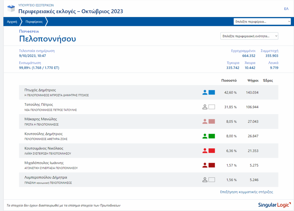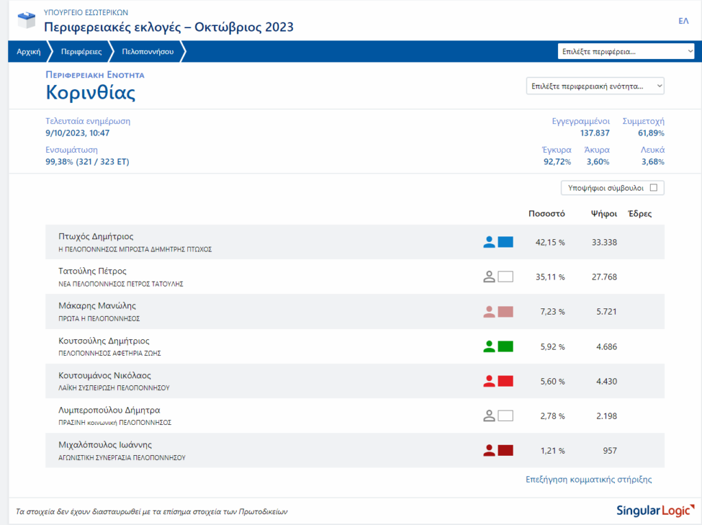 Στην Κορινθία, ειδικότερα, ο Δημήτρης Πτωχός έφτασε στο 42,15%, ο Πέτρος Τατούλης στο 35,11%, ο Μανώλης Μάκαρης στο 7,23% και ο Δημήτρης Κουτσούλης στο 5,92%.