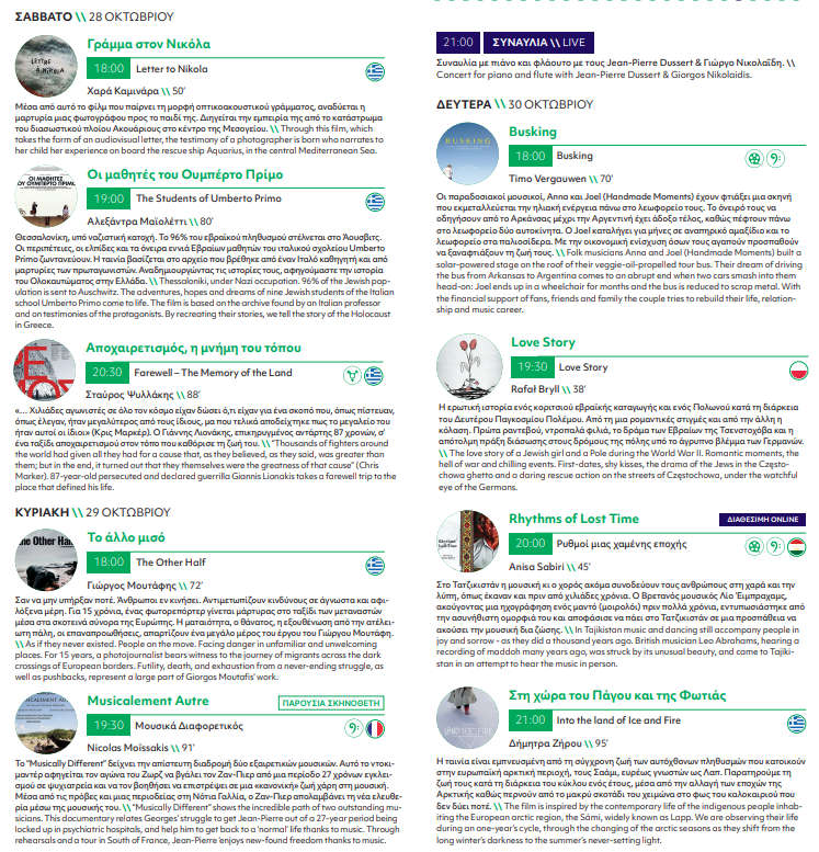 Το Φεστιβάλ θα έχει και εκπαιδευτική δράση, καθώς τη Δευτέρα 30 Οκτωβρίου θα γίνει προβολή ντοκιμαντέρ σε μαθητές Λυκείου, κάτι που αποτελεί πάντα ερέθισμα για συζήτηση και προβληματισμό.