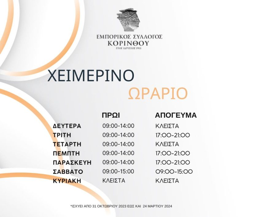 Σε ισχύ ειναι από την Δευτέρα το χειμερινό ωράριο των καταστημάτων. Όπως ανακοίνωσε ο Εμπορικός Σύλλογος Κορίνθου τα καταστήματα θα λειτουργούν 9 με 2 το πρωί όλες τις μέρες εκτός του Σαββάτου που θα είναι 9 με 3.