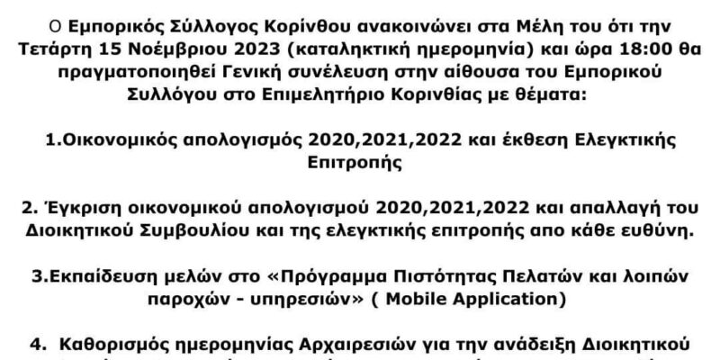 Σε τροχιά εκλογών και ανάδειξης του νέου διοικητικού του συμβουλίου μπαίνει ο Εμπορικός Σύλλογος Κορίνθου. Σήμερα είναι προγραμματισμένη να γίνει η Γενική Συνέλευση του συλλόγου, στις 6.00 το απόγευμα στο Επιμελητήριο Κορίνθου, η οποία θα κινήσει τις διαδικασίες με τον καθορισμό ημερομηνίας εκλογών, αλλά και εφορευτικής επιτροπής.