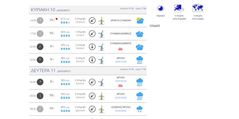 Τοπικές βροχές από νωρίς το απόγευμα στα δυτικά και βαθμιαία στα κεντρικά και τα νότια που τις βραδινές ώρες θα ενταθούν και θα εκδηλωθούν και σποραδικές καταιγίδες κυρίως στο Ιόνιο, την Πελοπόννησο, την Κρήτη, τα Δωδεκάνησα και βαθμιαία στην ανατολική Στερεά, την Εύβοια και τις Κυκλάδες. Μέσα στη νύχτα τα φαινόμενα θα ενταθούν.