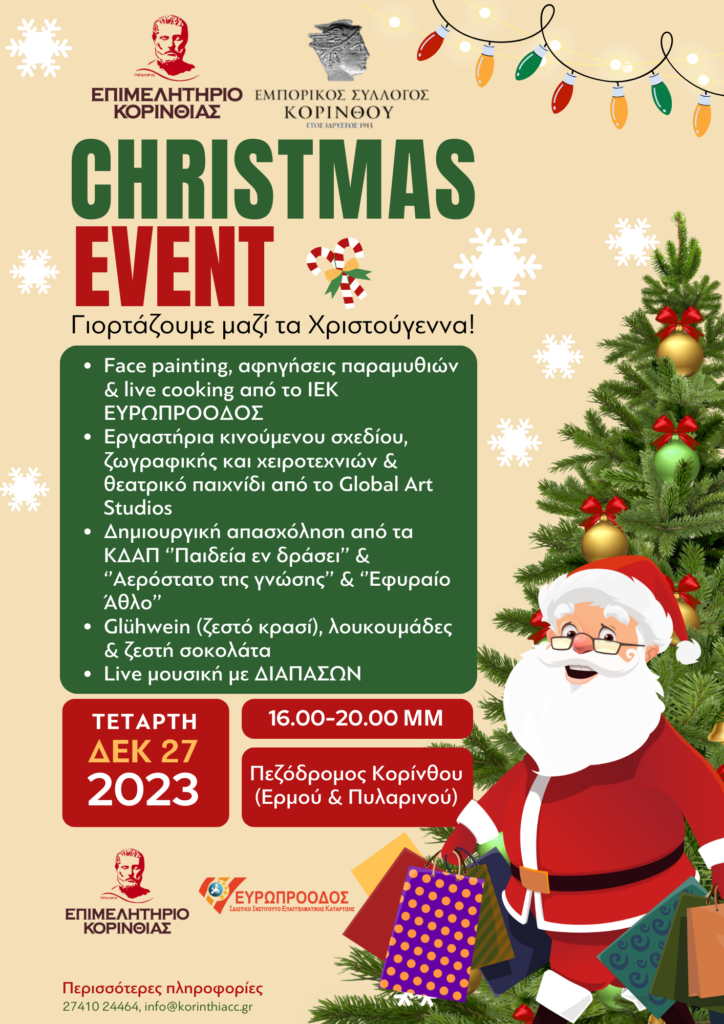 Με βασικό στόχο την τόνωση της ψυχολογίας και την ενίσχυση της αγοράς, μέσα από τη δημιουργία εορταστικού κλίματος κατά την περίοδο των Χριστουγέννων, το Επιμελητήριο Κορινθίας και ο Εμπορικός Σύλλογος Κορίνθου θα στήσουν ένα μεγάλο Χριστουγεννιάτικο πάρτυ με μουσική και δράσεις για τα παιδιά, θα στηθεί την Τετάρτη 27 Δεκεμβρίου 2023 στον πεζόδρομο της Κορίνθου.