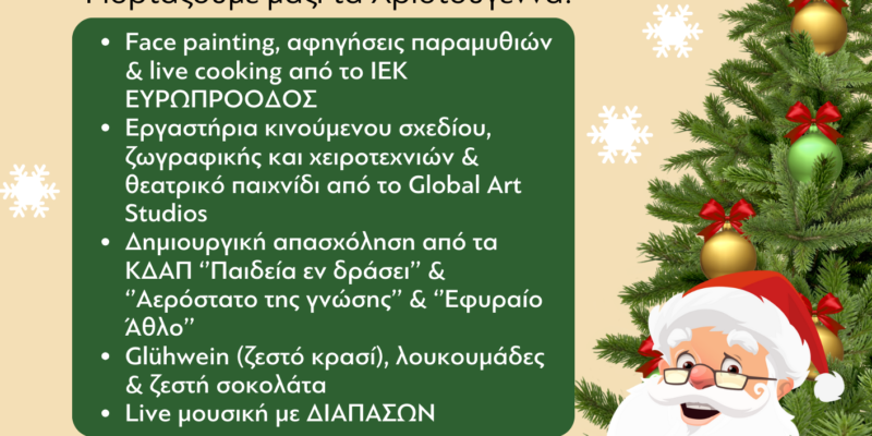 Στη χριστουγεννιάτικη εκδήλωση θα συμμετέχουν τα Εργαστήρια Ελευθέρων Σπουδών Global Arts Studios με εργαστήρια κινούμενου σχεδίου, ζωγραφικής, κατασκευών και θεατρικών αφηγήσεων, σκίτσο σε λίγα λεπτά, βίντεο με χάρτινους χαρακτήρες, θεατρικό παιχνίδι στην αφήγηση μιας ιστορίας για παιδιά όλων των ηλικιών.