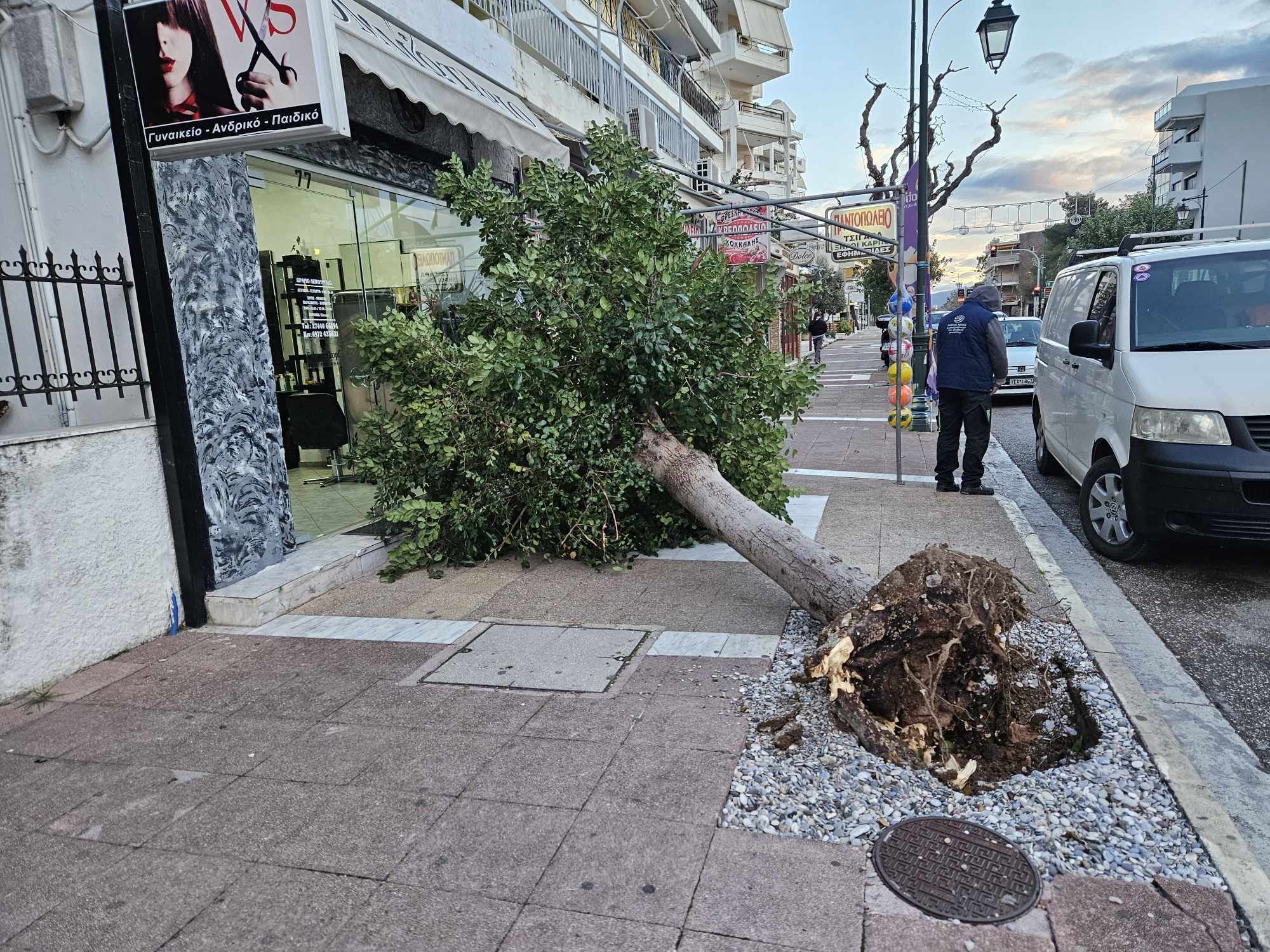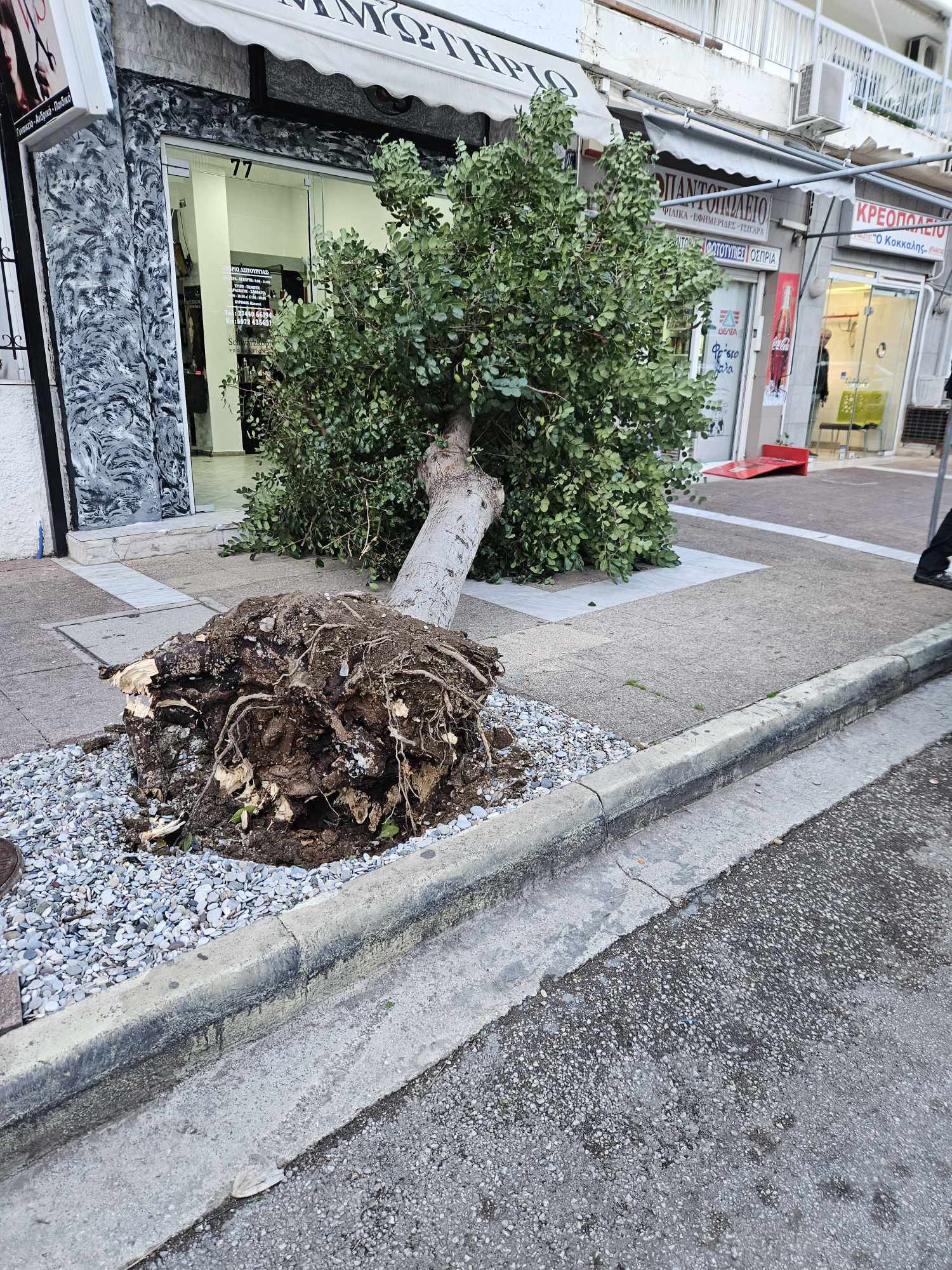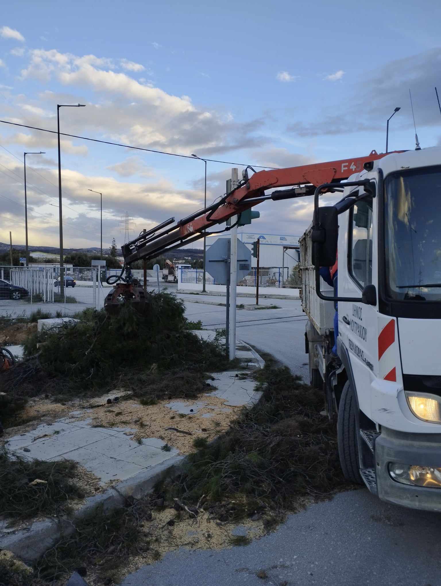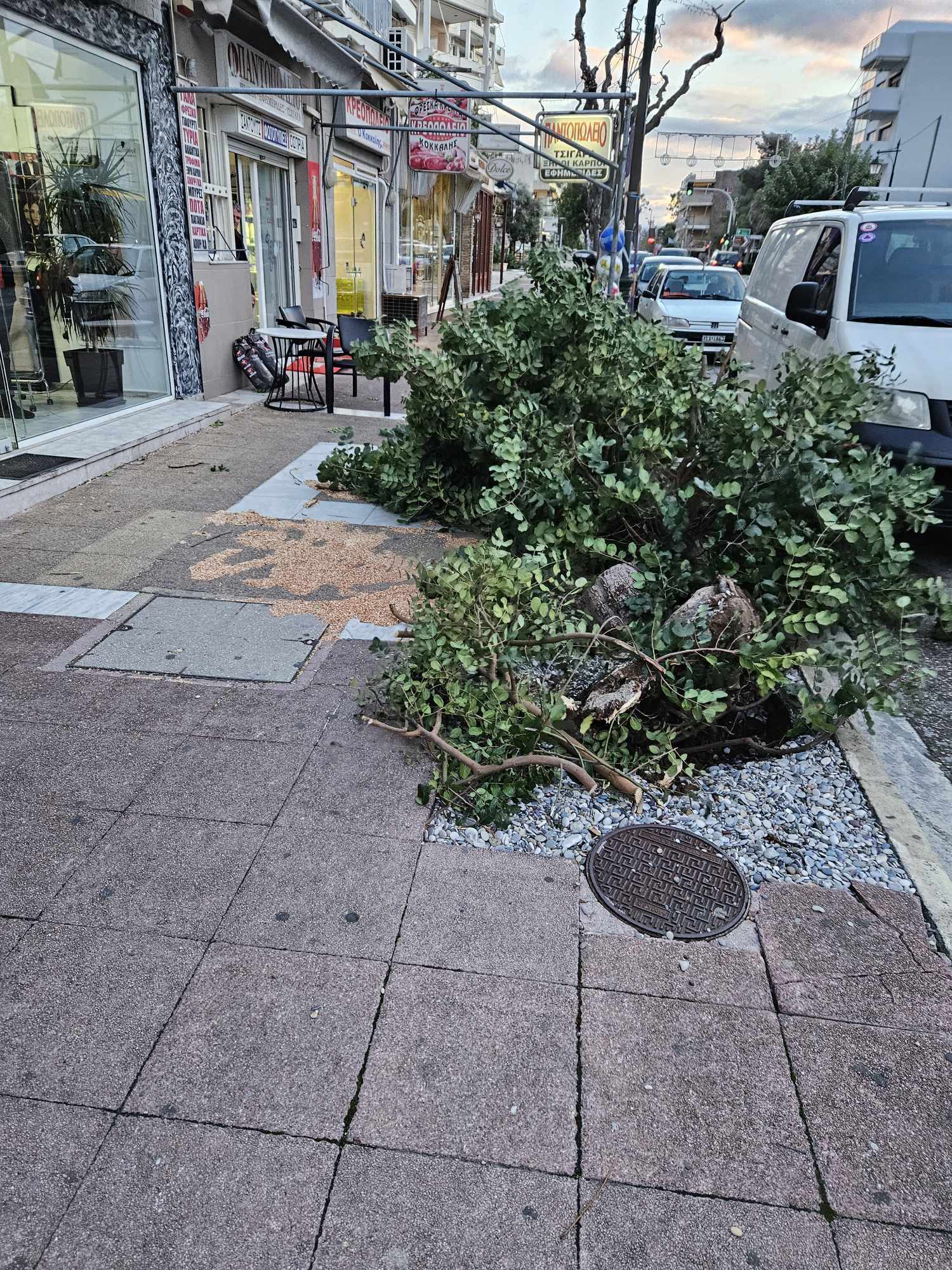 Αποτέλεσμα των έντονων καιρικών φαινομένων ήταν να σπάσουν πολλά δέντρα και να μετακινηθούν πολλοί κάδοι απορριμμάτων.
