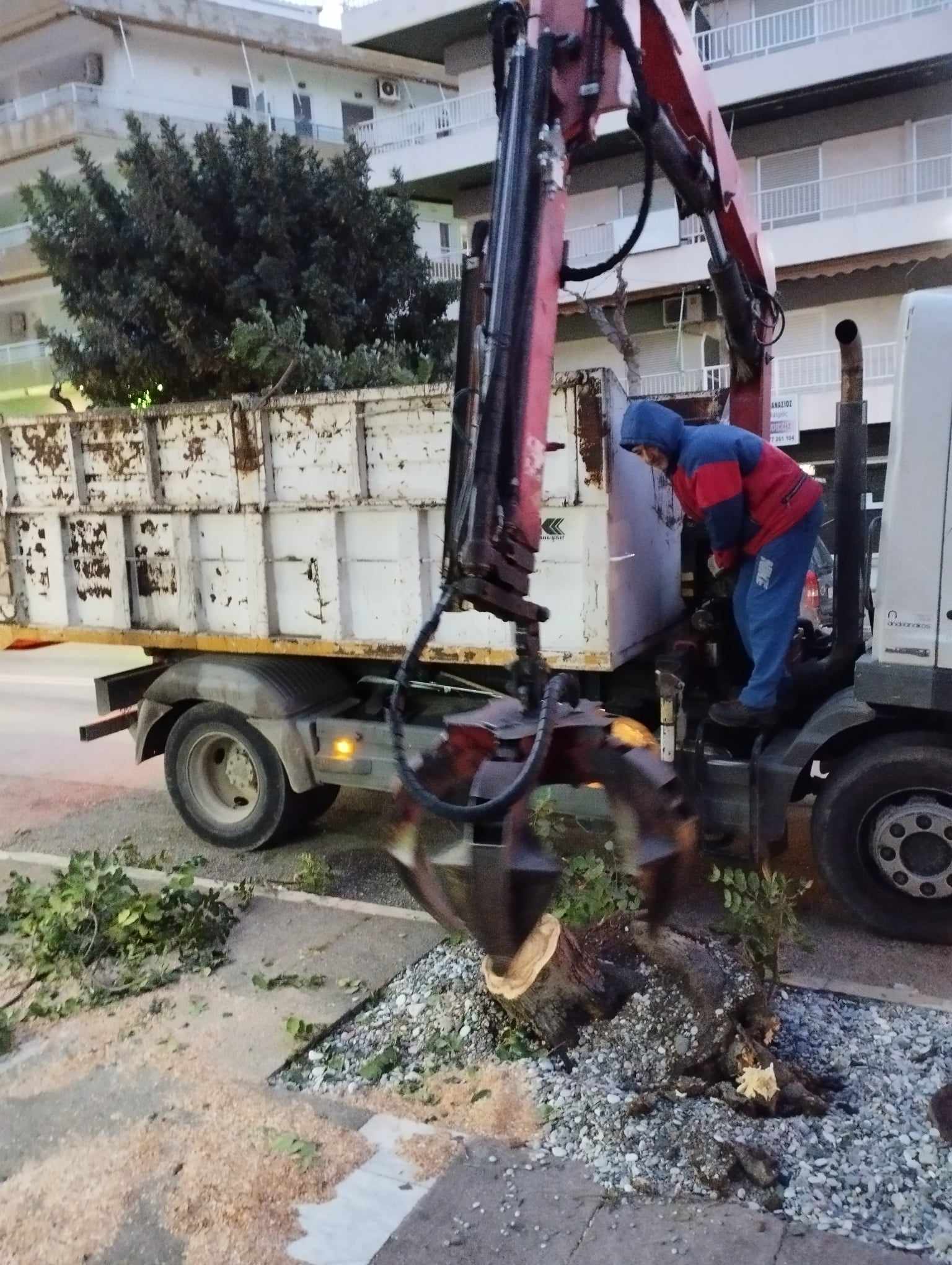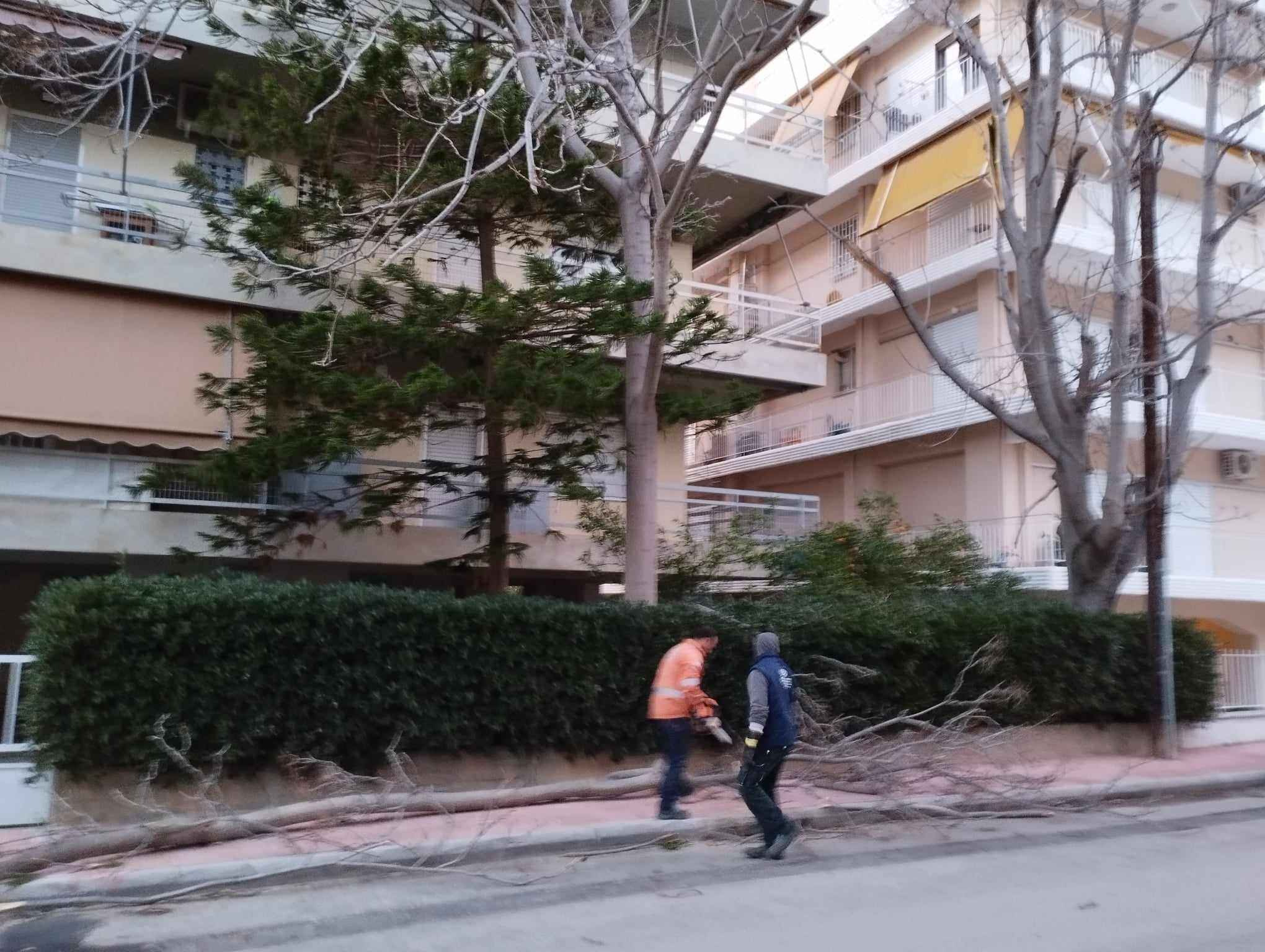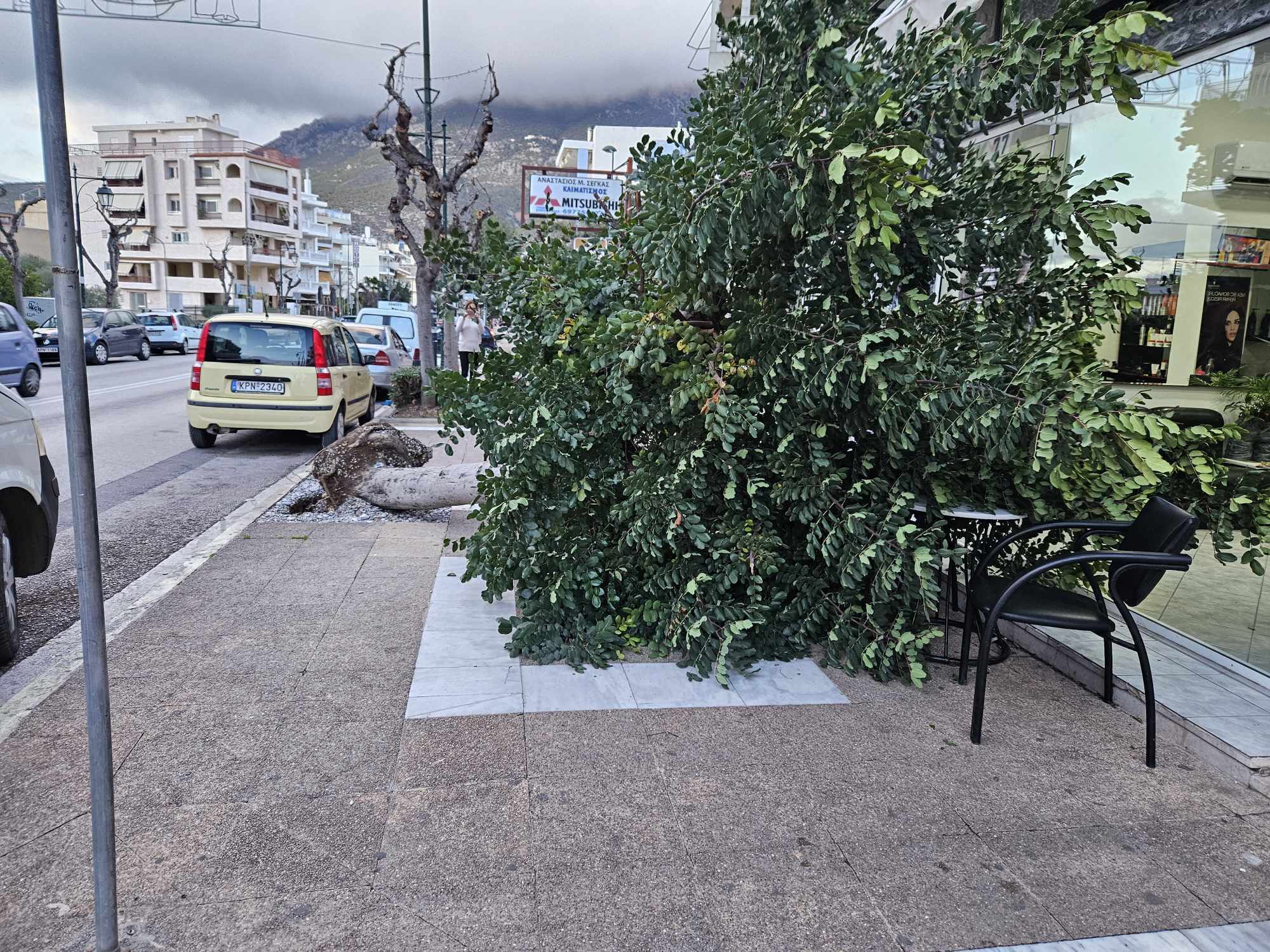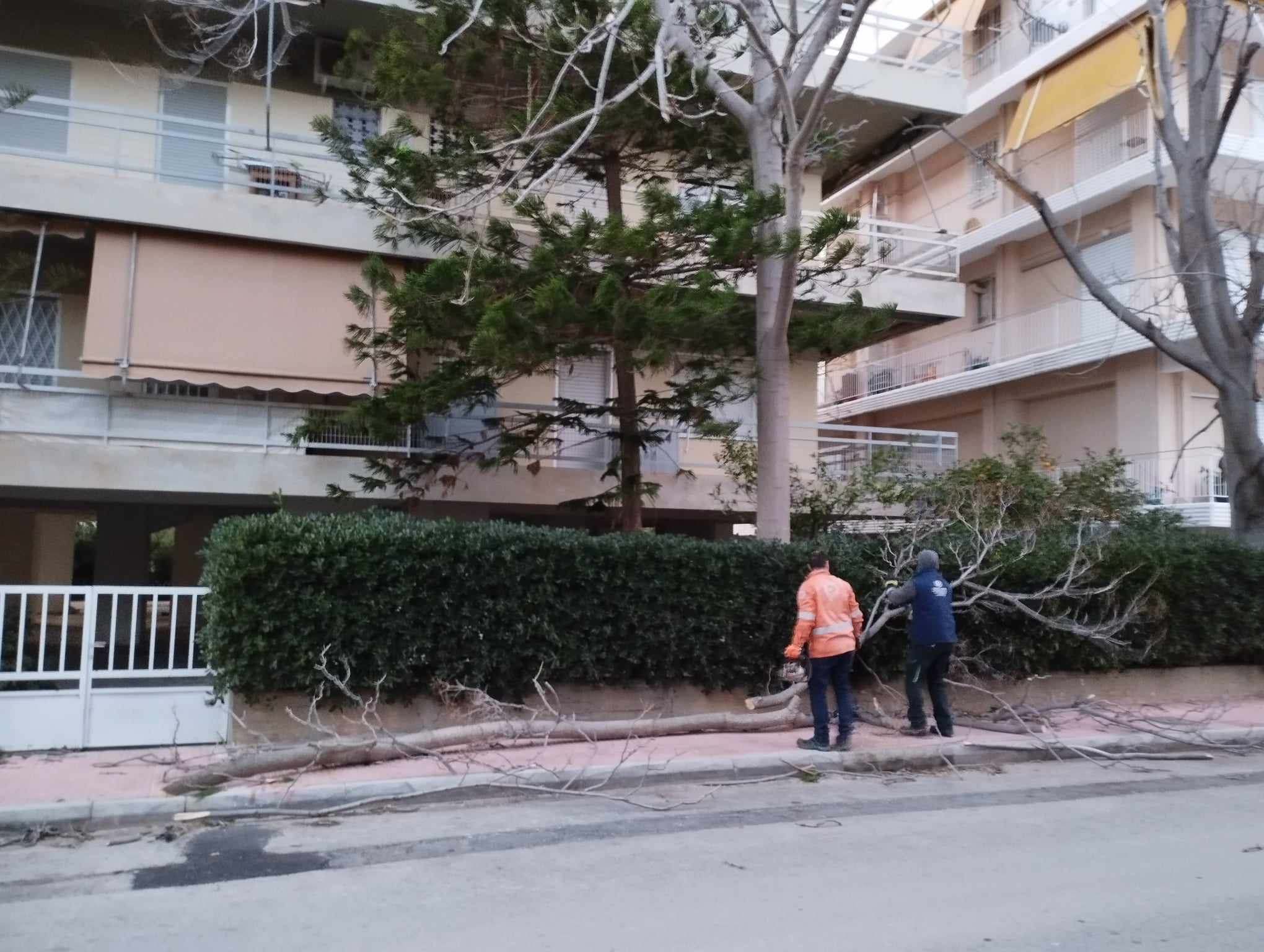 Αποτέλεσμα των έντονων καιρικών φαινομένων ήταν να σπάσουν πολλά δέντρα και να μετακινηθούν πολλοί κάδοι απορριμμάτων.