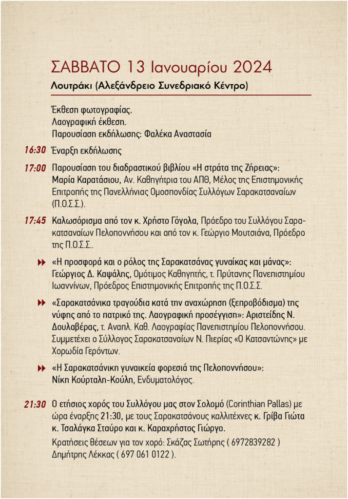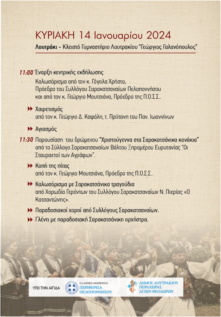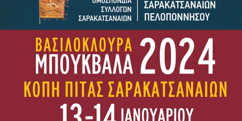 Διήμερο εκδηλώσεων που θα έχουν στο επίκεντρο την κοπή της πίτας του διοργανώνει ο Σύλλογος Σαρακτασαναίων Πελοποννήσου το ερχόμενο Σαββατοκύριακο 13 και 14 Ιανουαρίου.