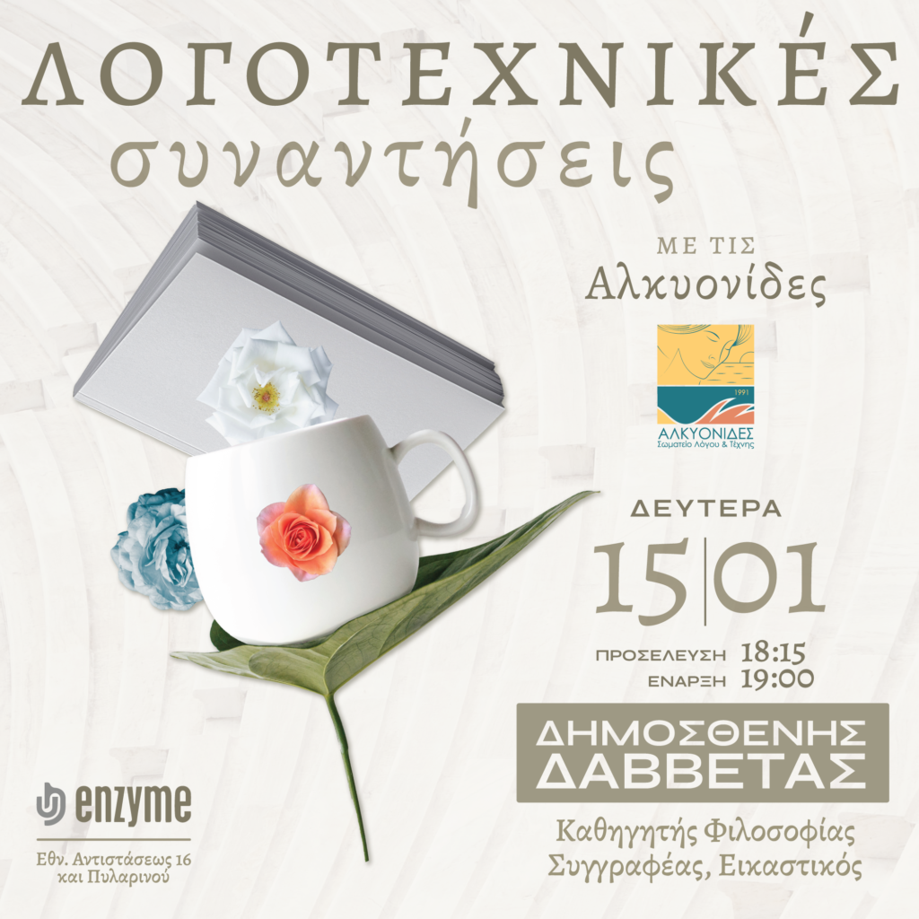 Η λογοτεχνική συνάντηση με τον Δημοσθένη Δαββέτα θα γίνει την Δευτέρα 15 Ιανουαρίου, στις 7 το βράδυ στο καφέ Enzyme.