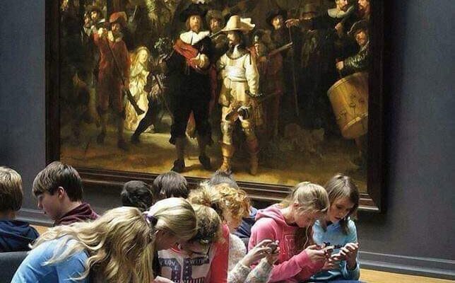 Εδώ βλέπουμε μια ομάδα μαθητών σε μια εκδρομή στο μουσείο Rijksmuseum, μπροστά στον σπουδαίο πίνακα του Ρέμπραντ “The Night Watch”. Ένας φωτογράφος απαθανατίζει τη στιγμή που τα παιδιά κοιτάζουν τα κινητά τους.