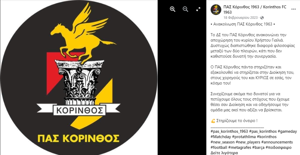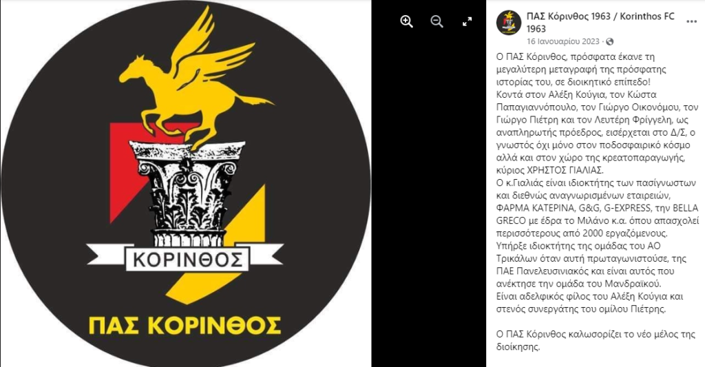 Ο Χρήστος Γιαλιάς πέρυσι (16 Ιανουαρίου 2023), είχε παρουσιαστεί από τον ΠΑΣ Κόρινθος ως “η μεγαλύτερη μεταγραφή της ιστορίας του σε διοικητικό επίπεδο“, αδελφικός φίλος του προέδρου του ΠΑΣ Κόρινθος Αλέξη Κούγια και στενός συνεργάτης του Ομίλου Πιέτρης.