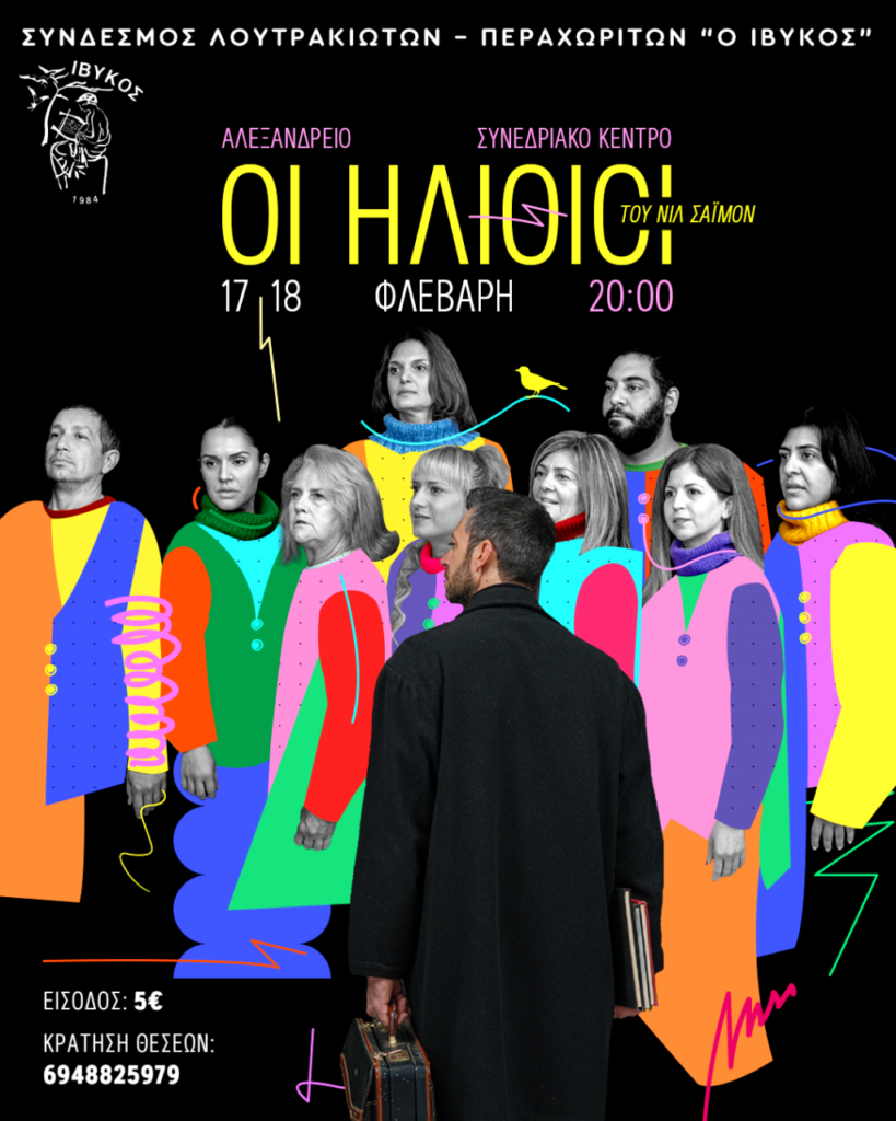 Ο «Ίβυκος» σας προσκαλεί στην κωμωδία «Οι Ηλίθιοι» του Νιλ Σάιμον, σε διασκευή των Μαρία Τσομπανάκου και Μαργαρίτα Αλεξίου, το Σάββατο 17 και την Κυριακή 18 Φεβρουαρίου 2024 & ώρα 20:00, στο Αλεξάνδρειο Συνεδριακό Κέντρο, στο Λουτράκι.