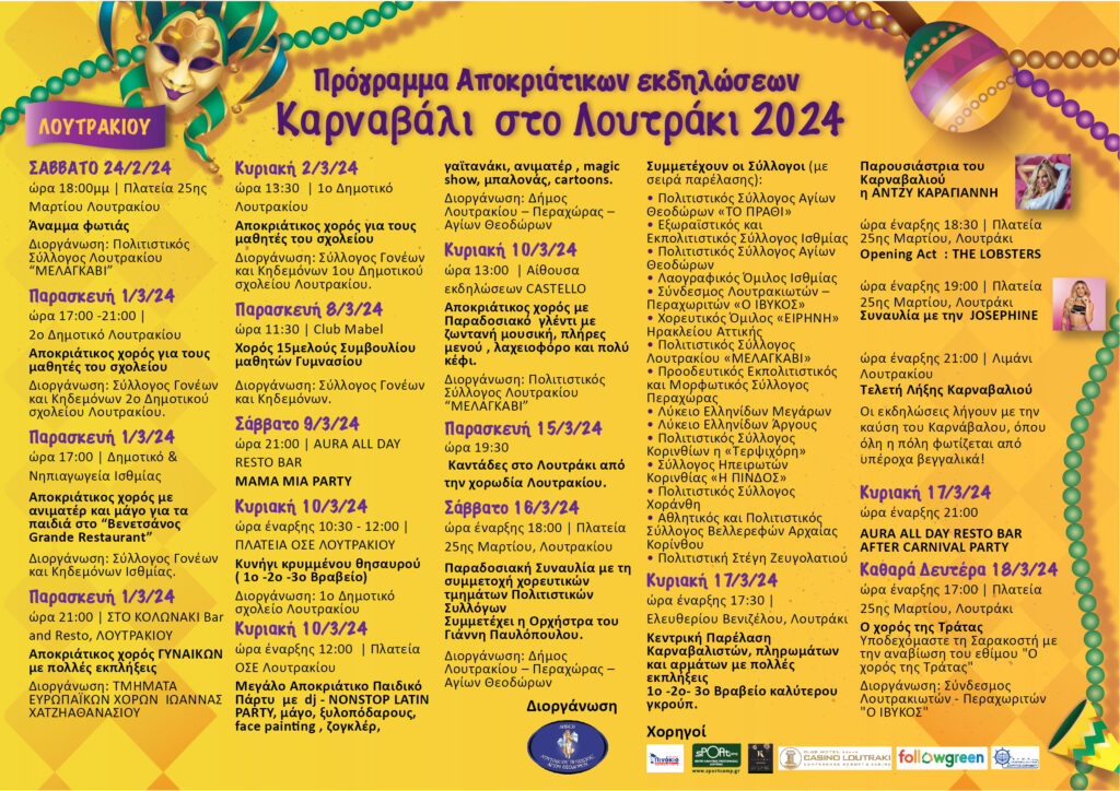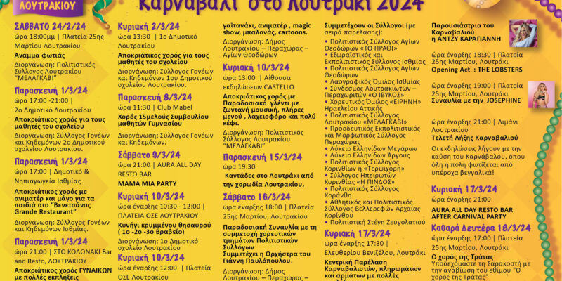 Τις εκδηλώσεις για το Καρναβάλι 2024 στον δήμο Λουτρακίου ανακοίνωσε ο δήμος Λουτρακίου. Οι εκδηλώσεις ξεκινούν το επόμενο Σάββατο 24 Φεβρουαρίου με το Άναμμα της Φωτιάς στην κεντρική πλατεία του Λουτρακίου και ολοκληρώνονται την Καθαρά Δευτέρα 18 Μαρτίου, με τον Χορό της Τράτας…