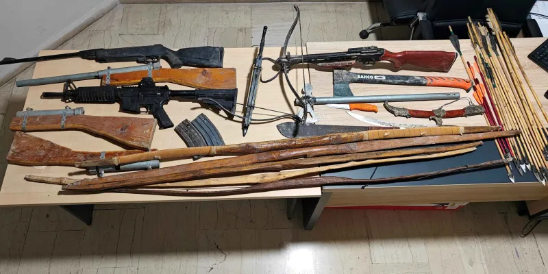 Βρέθηκαν και κατασχέθηκαν ένα αυτοσχέδιο τυφέκιο, ένα αεροβόλο όπλο, 102 κυνηγετικά φυσίγγια, 81 σφαίρες πολεμικού όπλου, 7 αυτοσχέδια τόξα, 20 βέλη, 4 μαχαίρια και ένα τσεκούρι.