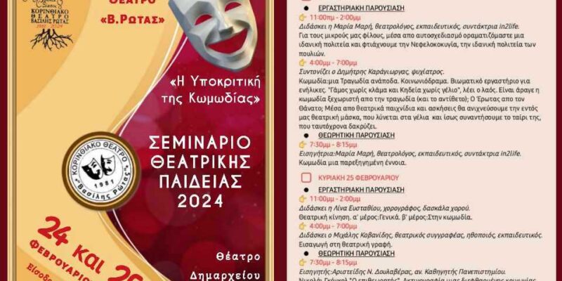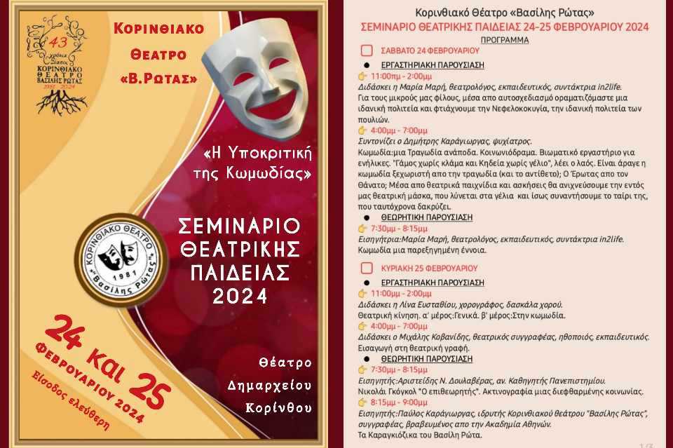 Ένα διήμερο σεμινάριο για όσους έχουν το μικρόβιο του θεάτρου και θέλουν να ανέβουν στην σκηνή έστω και ερασιτεχνικά θα πραγματοποιήσει το κορινθιακό θέατρο “Βασίλης Ρώτας”. Το σεμινάριο θα πραγματοποιηθεί το επόμενο Σάββατοκύριακο 24 και 25 Φεβρουαρίου και θα διδάξουν θεατρολόγοι, χορογράφοι. συγγραφείς, ψυχολόγοι κ.λπ