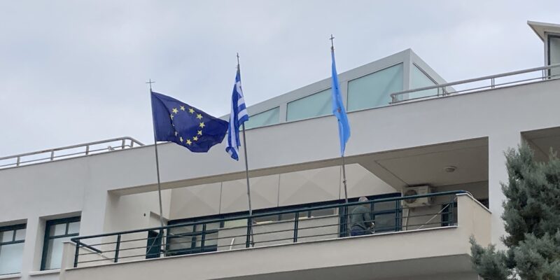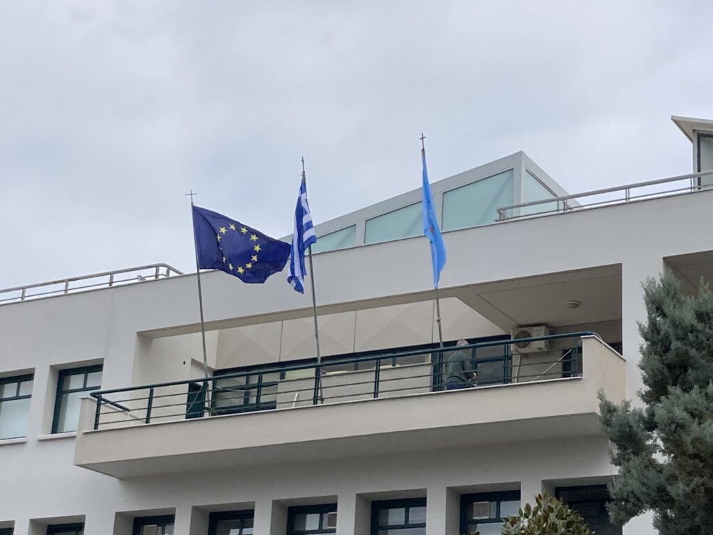 Αντικατάσταση των φθαρμένων σημαιών στο δημαρχείο έγινε την Παρασκευή το πρωί, με έναν εργαζόμενο να αλλάζει και τις τρεις σημαίες: της ΕΕ, της Ελλάδας και του δήμου Κορινθίων