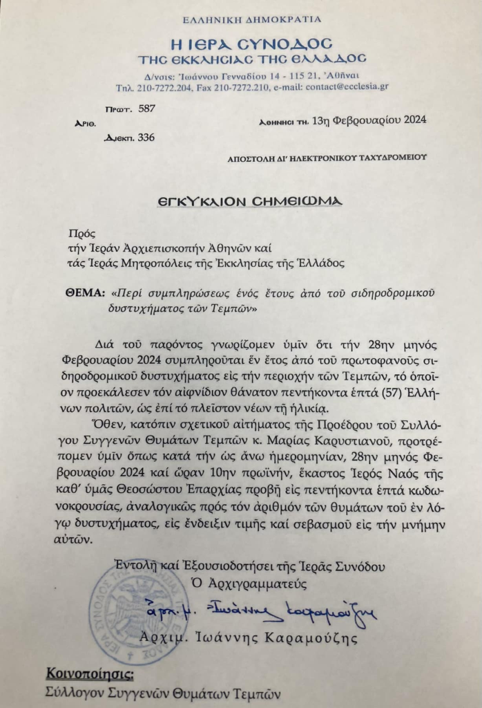 Η πρόεδρος του Συλλόγου Συγγενών Θυμάτων Τεμπών 2023, Μαρία Καρυστιανού με ανάρτησή της ενημέρωσε πως ο σύλλογος έκανε σχετικό αίτημα στην Ιερά Αρχιεπισκοπή Αθηνών η οποία το έκανε αποδεκτό.