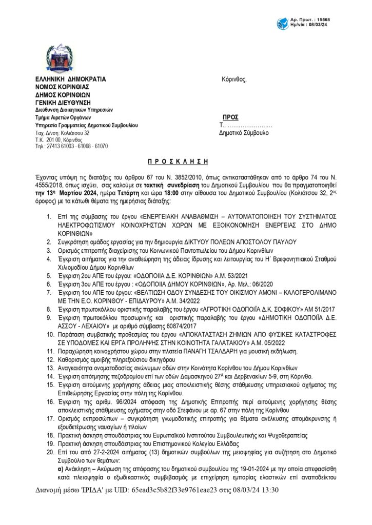 Για την Τετάρτη το απόγευμα, στις 6.00, μεταφέρεται τελικά το προγραμματισμένο για σήμερα δημοτικό συμβούλιο Κορινθίων.