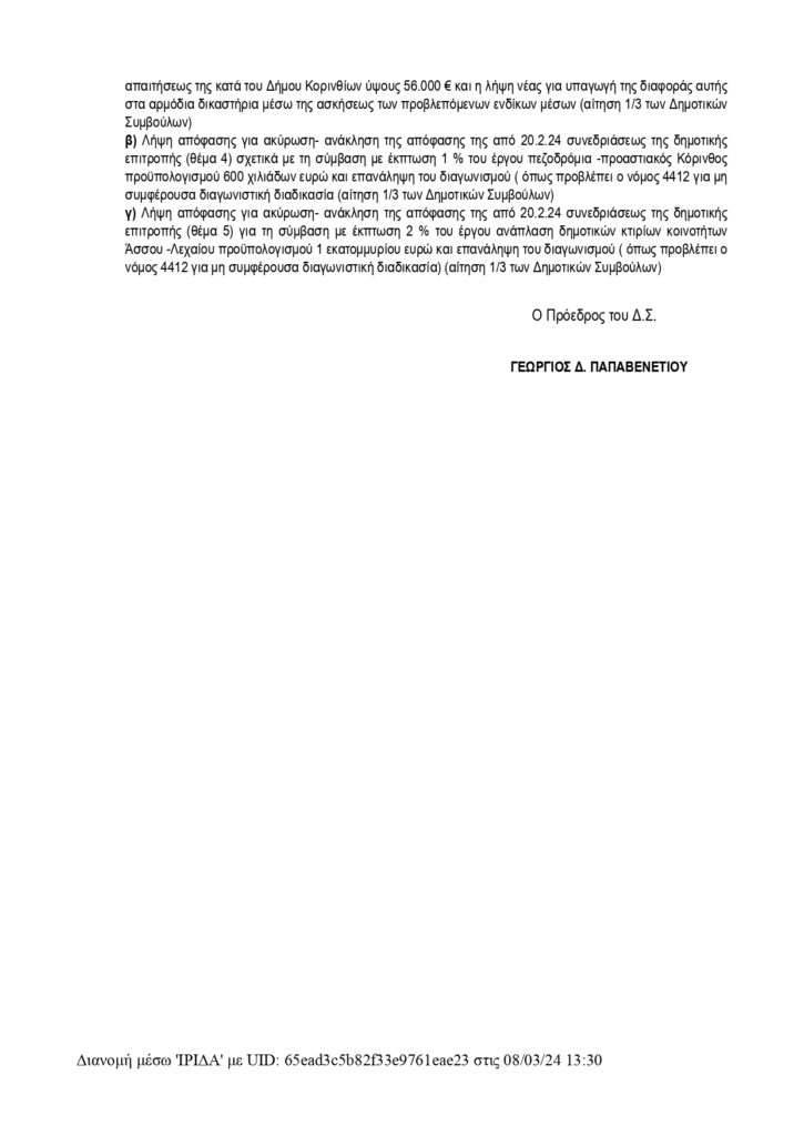 - η ανάκληση της απόφασης της δημοτικής επιτροπής για τον ανάδοχο στο έργο των πεζοδρομίων στην διαδρομή Προαστιακός – κέντρο Κορίνθου,