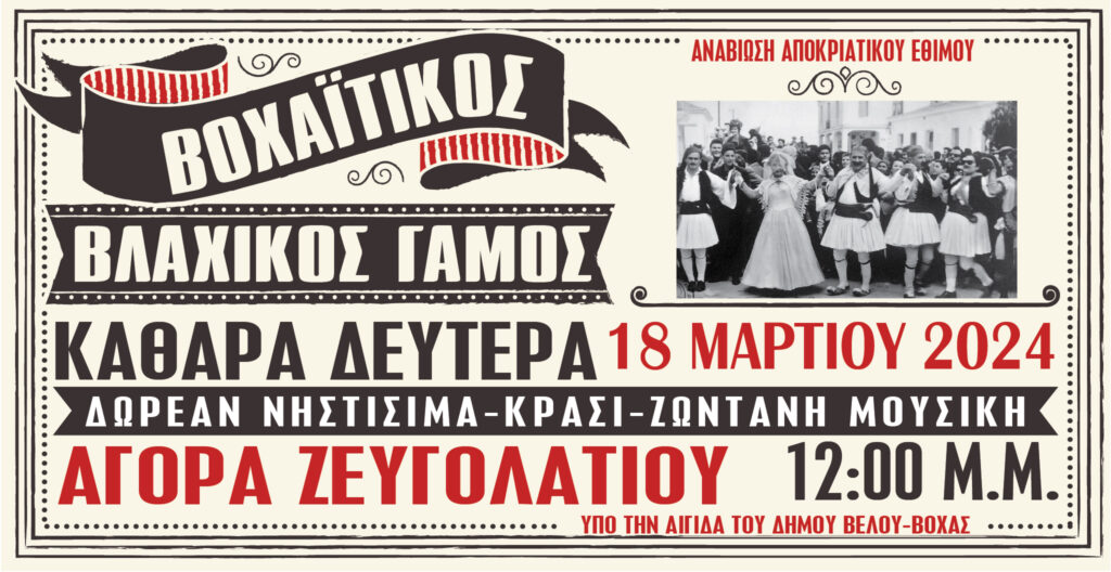 Τον Βοχαΐτικο Βλάχικο Γάμο, μία από τις πιο γνωστές παραδοσιακές γιορτές στην Κορινθια, θα παρουσιάσουν και φέτος απο κοινού, η Δημοτική Κοινότητα Ζευγολατιού, η Φιλαρμονική Ζευγολατιού, η Πνευματική Στέγη Ζευγολατιού και ο Πολιτιστικός και Λαογραφικός Σύλλογος Βόχας. Η γιορτή θα πραγματοποιηθεί την Καθαρά Δευτέρα, στο Ζευγολατιό, συνεχίζοντας μια παράδοση δεκάδων ετών.