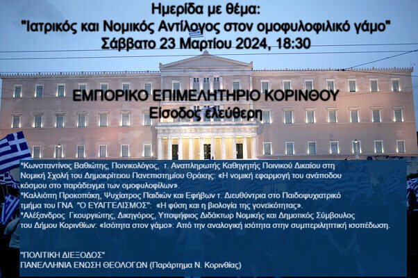 Μία ημερίδα, η οποία θα έχει στο επίκεντρό της τον προβληματισμό για την πρόσφατη θέσπιση του γάμου ατόμων του ιδίου φύλου, διοργανώνουν η δημοτική παράταξη «ΠΟΛΙΤΙΚΗ ΔΙΕΞΟΔΟΣ» και το παράρτημα Κορινθίας της Πανελλήνιας Ένωσης Θεολόγων.
