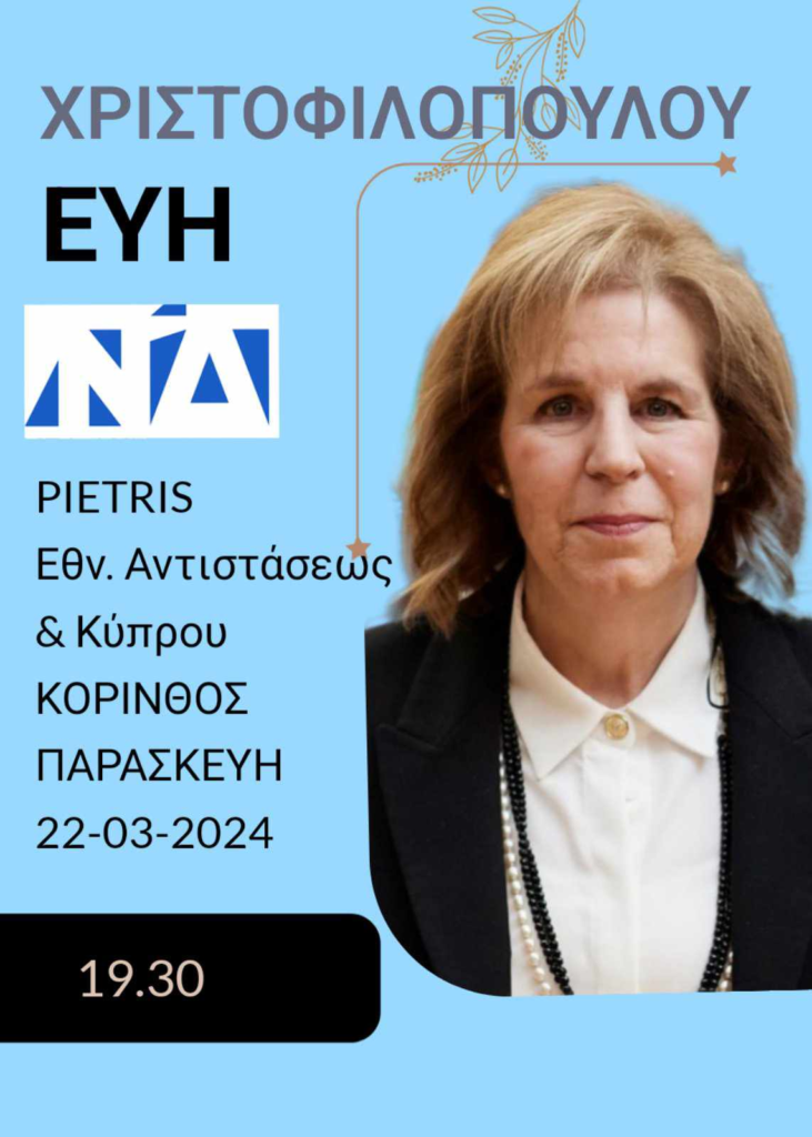 Την Παρασκευή το απόγευμα η πρώην υπουργός του ΠΑΣΟΚ Έφη Χριστοφιλοπούλου, υποψήφια πλέον με τη ΝΔ, έρχεται στην Κόρινθο για να μιλήσει σε εκδήλωση που διοργανώνει η ΝΟΔΕ Κορινθίας.