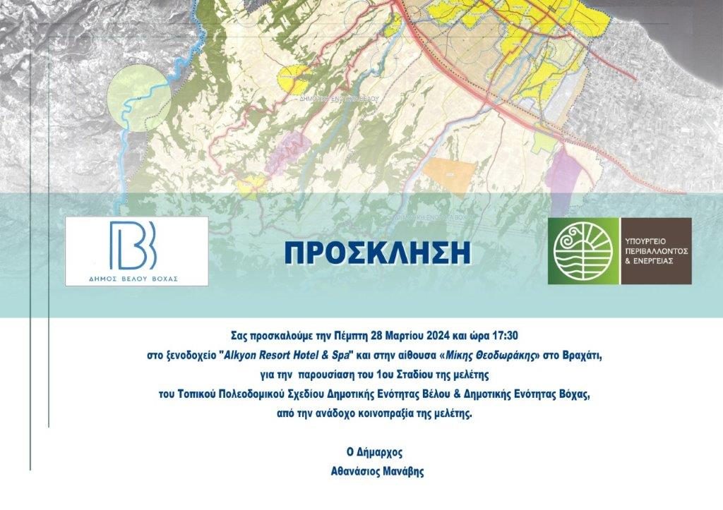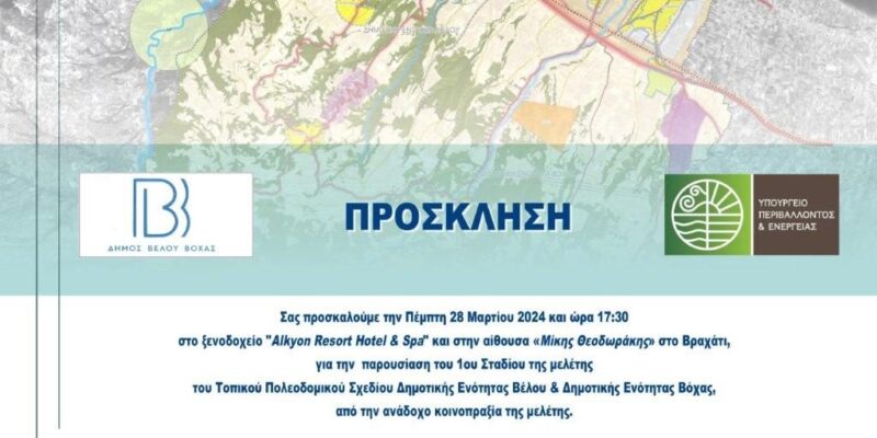 Την Πέμπτη 28 Μαρτίου 2024 & ώρα 17:30, στο ξενοδοχείο “Alkyon Resort Hotel & Spa” και στην αίθουσα «Μίκης Θεοδωράκης» στο Βραχάτι, θα γίνει η παρουσίαση του 1ου Σταδίου της μελέτης του Τοπικού Πολεοδομικού Σχεδίου Δημοτικής Ενότητας Βέλου & Δημοτικής Ενότητας Βόχας, από την ανάδοχο κοινοπραξία της μελέτης.