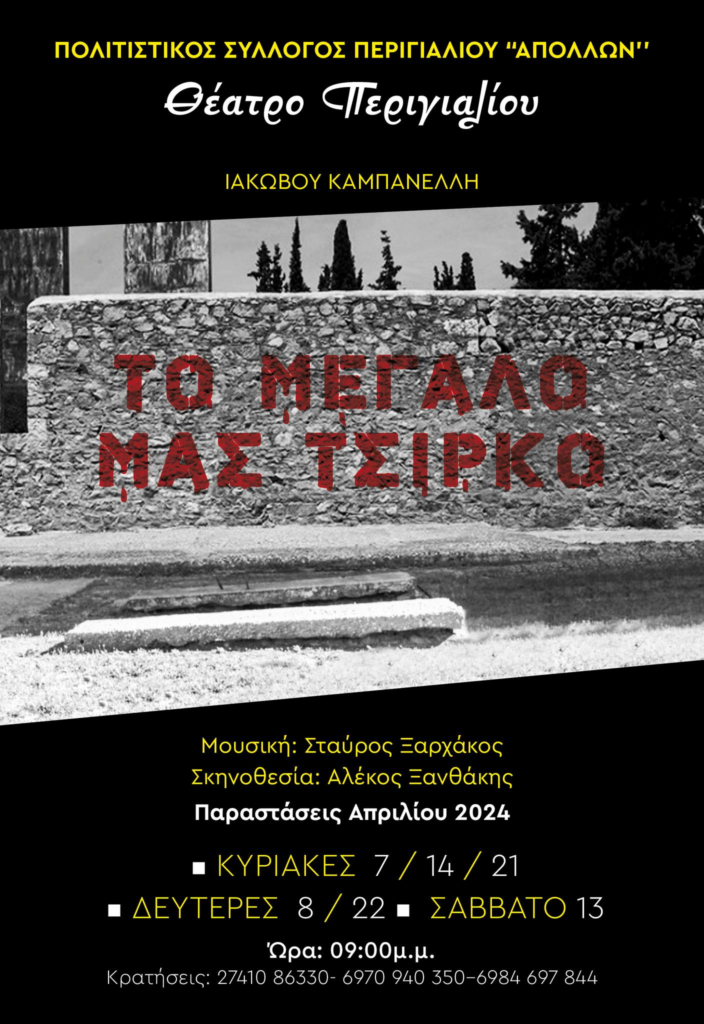 Η τεράστια αποδοχή και αγάπη που έδειξαν αμέσως οι Κορίνθιοι για την παράσταση που ανέβασε το Θέατρο Περιγιαλίου “Το Μεγάλο μας Τσίρκο”, του Ιάκωβου Καμπανέλη, ήταν αναμενόμενη και “υποχρέωσε” τους συντελεστές της να παρατείνουν τις παραστάσεις και τον Απρίλιο.
