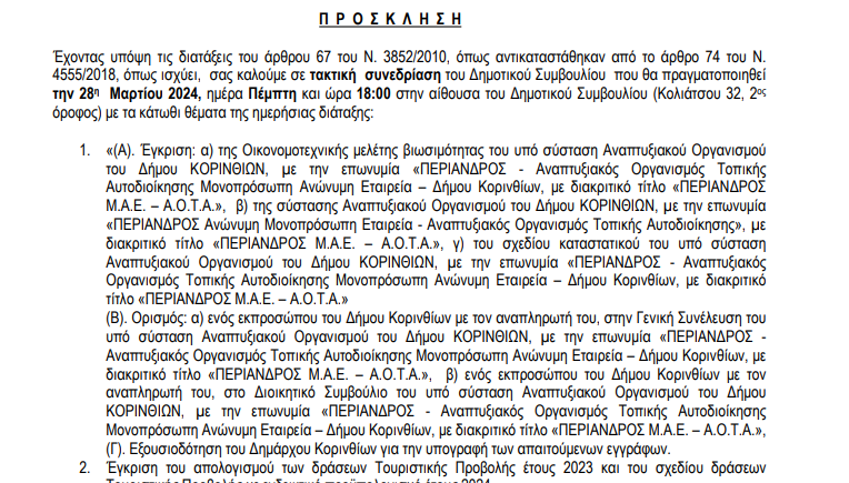 Ειδικότερα, όπως αναφέρεται χαρακτηριστικά στο θεματολόγιο του δημοτικού συμβουλίου, στο πρώτο θέμα θα συζητηθεί καταρχάς, η έγκριση της Οικονομοτεχνικής Μελέτης Βιωσιμότητας του υπό σύσταση Αναπτυξιακού Οργανισμού του Δήμου ΚΟΡΙΝΘΙΩΝ, µε την επωνυμία «ΠΕΡΙΑΝΔΡΟΣ – Αναπτυξιακός Οργανισμός Τοπικής Αυτοδιοίκησης Μονοπρόσωπη Ανώνυμη Εταιρεία – Δήμου Κορινθίων και με διακριτικό τίτλο «ΠΕΡΙΑΝΔΡΟΣ Μ.Α.Ε. – Α.Ο.Τ.Α.».