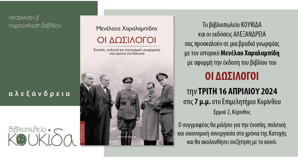 - Τον Μενέλαο Χαραλαμπίδη που θα παρουσιάσει την Τρίτη 16 Απριλίου στις 7μμ το βιβλίο του “Οι Δοσίλογοι” στο Επιμελητήριο Κορίνθου.