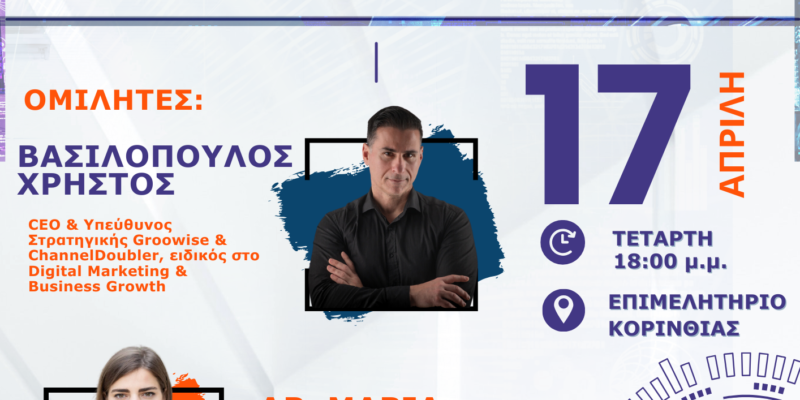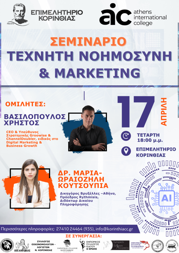 Το Επιμελητήριο Κορινθίας διοργανώνει μαζί με το Διεθνές Κολλέγιο Αθηνών την Τετάρτη 17 Απριλίου στις 18:00 το σεμινάριο Τεχνητή Νοημοσύνη & Marketing στο αμφιθέατρο “ΓΙΑΝΝΗΣ ΛΑΡΣΙΝΟΣ” του Επιμελητηρίου Κορινθίας, Ερμού 2, Κόρινθος.