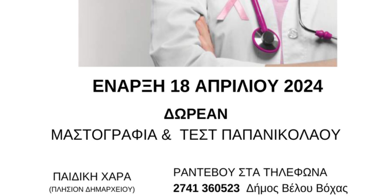 Το πρόγραμμα αφορά την πρόληψη και την έγκαιρη διάγνωση του καρκίνου του μαστού και του τραχήλου της μήτρας και περιλαμβάνει εξέταση Μαστογραφίας και Τεστ Παπανικολάου, υπό την αιγίδα της Περιφέρειας Πελοποννήσου και το συντονισμό της Γενικής Διεύθυνσης Δημόσιας Υγείας & Κοινωνικής Μέριμνας, σε αγαστή συνεργασία με το Δήμο Βέλου-Βόχας.