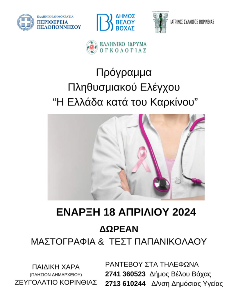 Ένα ακόμα πρόγραμμα πληθυσμιακού ελέγχου καρκίνου για τις γυναίκες που κατοικούν μόνιμα στον Δήμο Βέλου-Βόχας θα πραγματοποιηθεί αύριο 18 Απριλίου στο Ζευγολατιό.