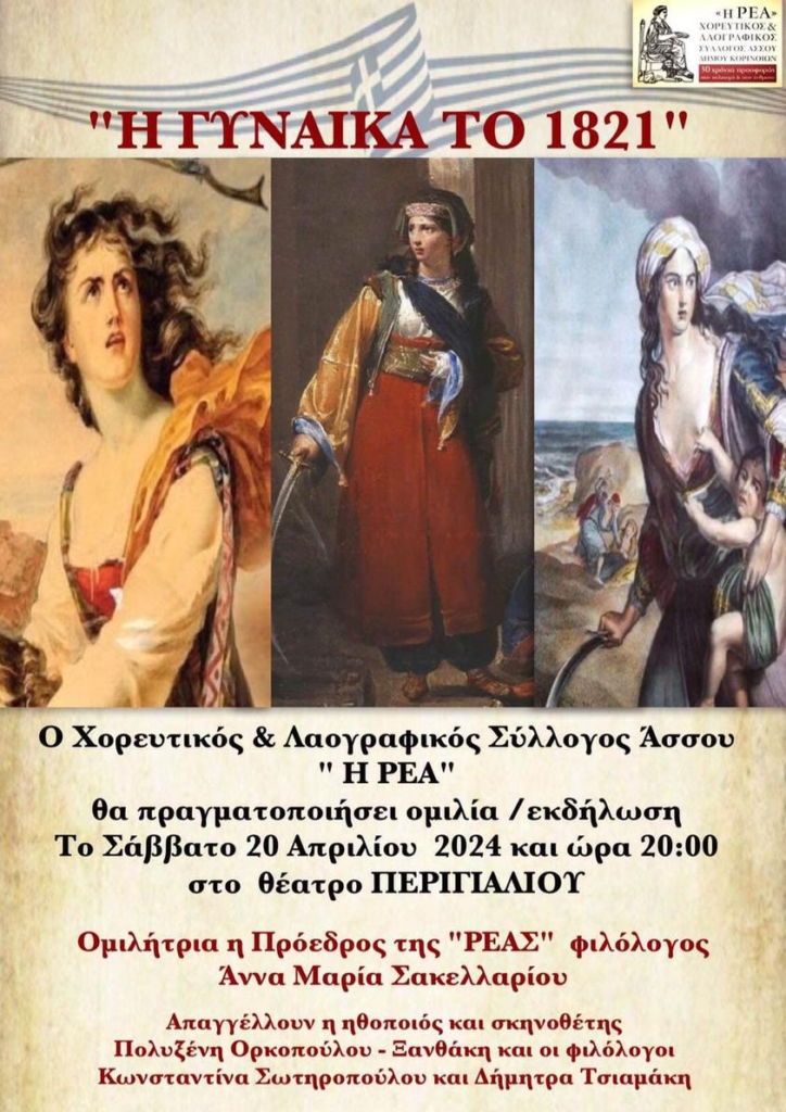 Στο Περιγιαλι και στον φιλόξενο χώρο του Θεάτρου του Περιγιαλίου, ο Χορευτικός & Λαογραφικός Σύλλογος Άσσου « Η ΡΕΑ» θα πραγματοποιήσει ομιλία/εκδήλωση με θέμα «Η γυναίκα το 1821» το Σάββατο 20 Απριλίου στις 8:00 μμ.
