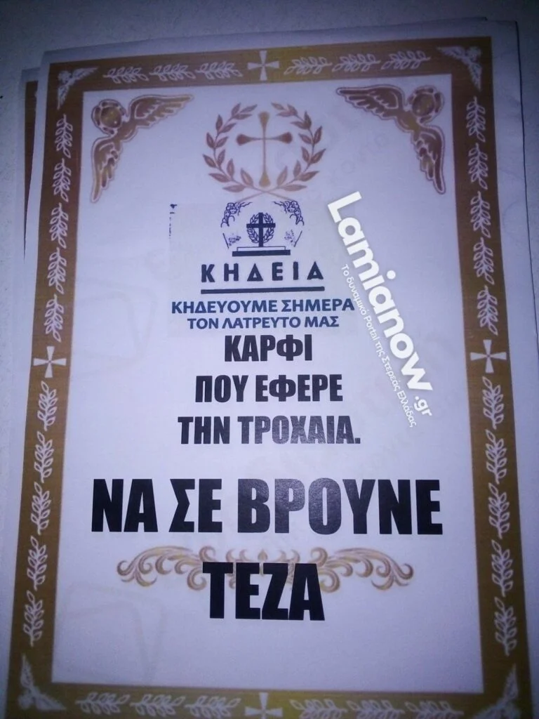 Λαμία: Τύπωσε κηδειόχαρτα γι’ αυτόν που τον «κάρφωσε» στην Τροχαία -«Να σε βρούνε τέζα» [εικόνα]