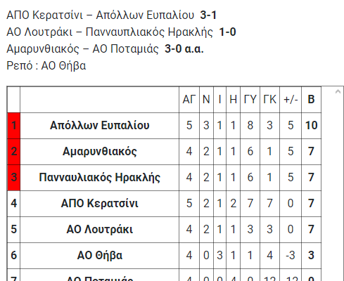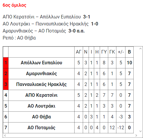 Στα άλλα παιχνίδια το Κερατσίνι κέρδισε με 3-1 τον Απόλλωνα Ευπαλίου και διατηρεί λιγοστές ελπίδες να πάρει μία από τις τρεις θέσεις, όπως και ο Αμαρυνθιακός που κέρδισε άνευ αγώνα την Ποταμιά. Ρεπό είχε η Θήβα.